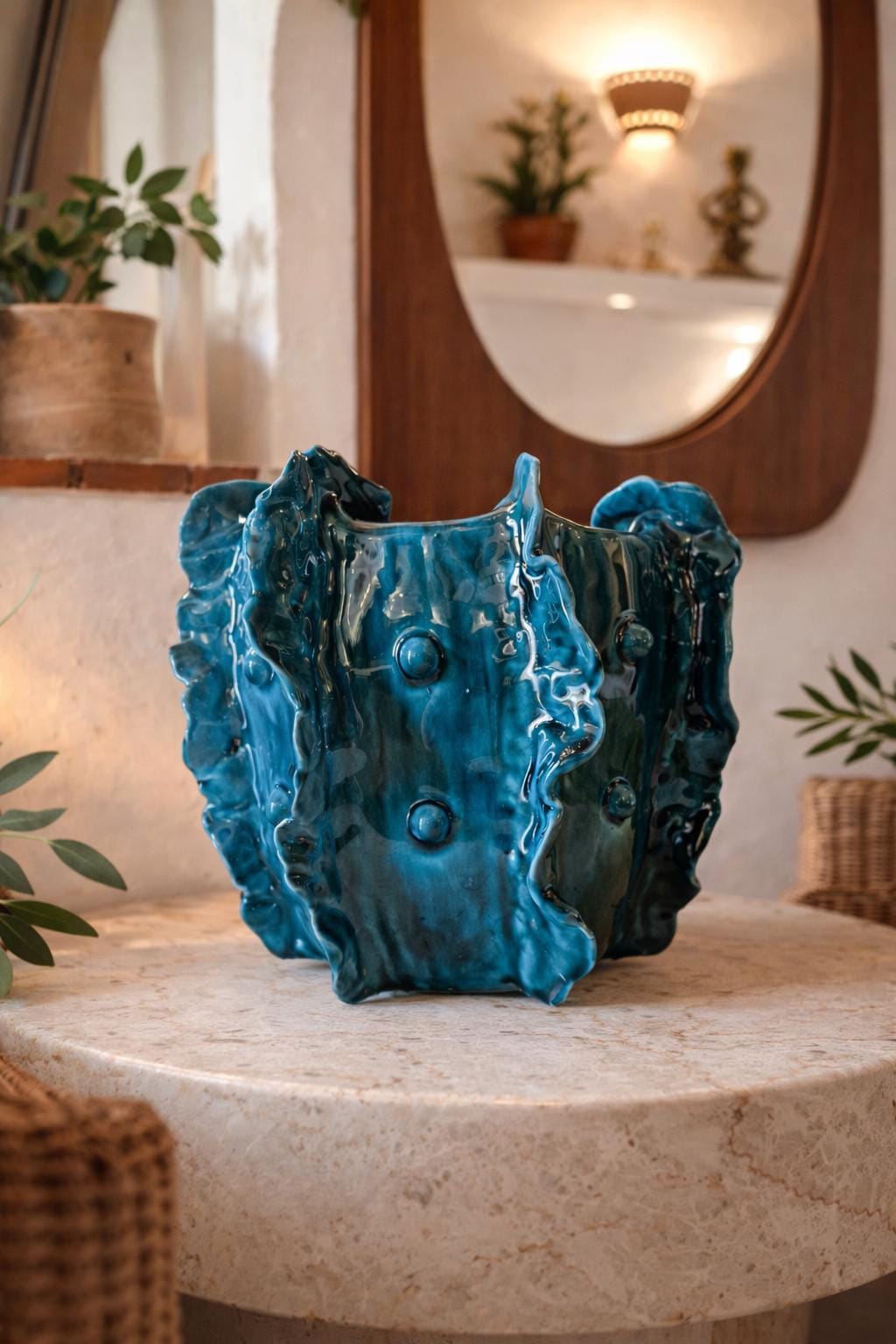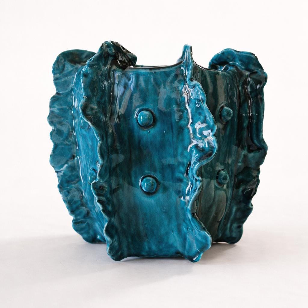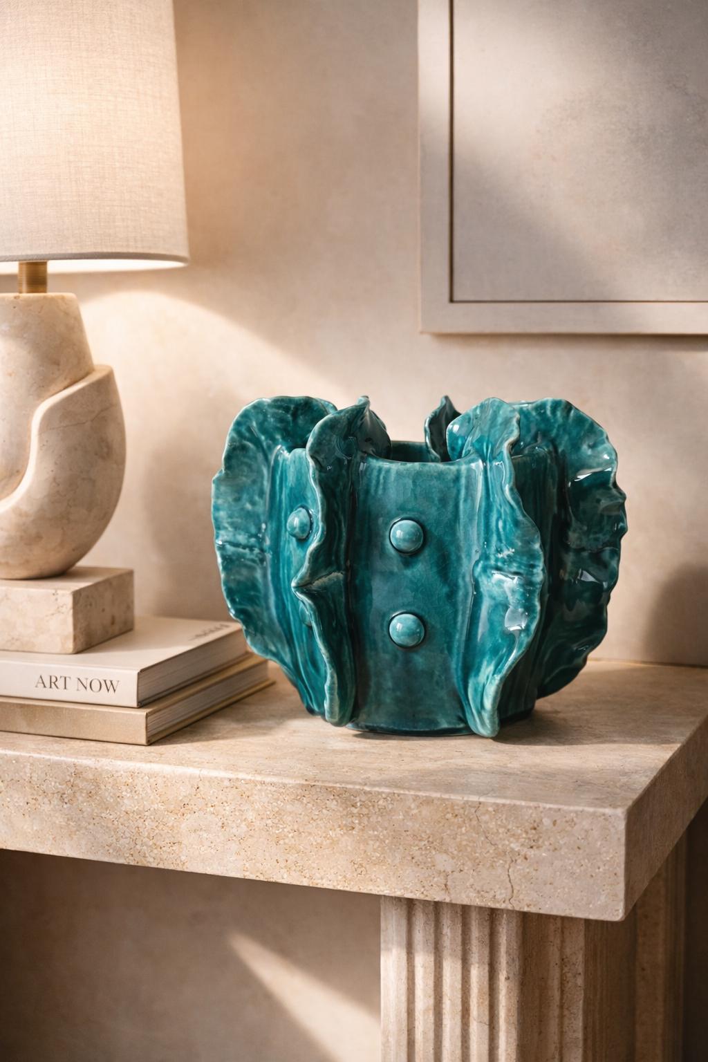Discover Galena, a unique artistic vase handcrafted from white clay and finished with iridescent blue and green crystalline hues. Its wavy, organic forms evoke the deep sea and mysterious corals of the realm of Poseidon, the Greek god of the sea. Every detail, from the fluid curves to the raised bubbles, is the result of meticulous craftsmanship, making this piece truly unique. Each piece is unique, made entirely by hand without molds. Irregularities, crackle effects, and glaze variations are natural and intentional characteristics of craftsmanship: they add character and make your piece unique.