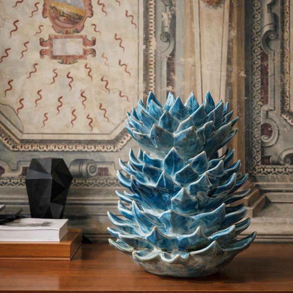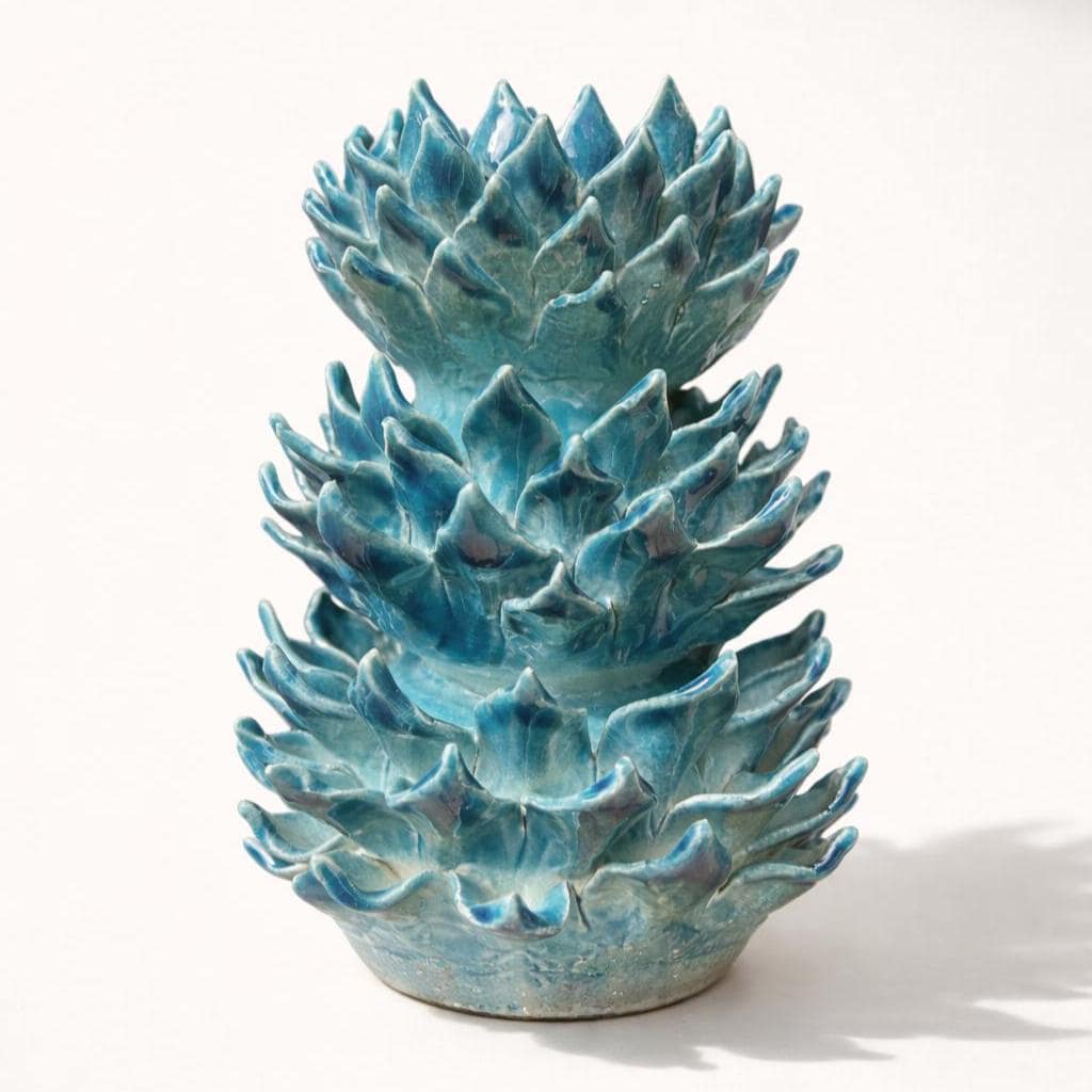From the *Cynara* series comes Asteria, a sculptural vase crafted entirely by hand from glazed ceramic. Inspired by the natural shape of the artichoke, this piece comes to life through three tiers of petals that open toward the sky, reminiscent of a nocturnal bloom or a crystallized sea creature. The intense blue color with crystalline nuances gives the vase a mystical presence, suspended between the sea and the starry sky.