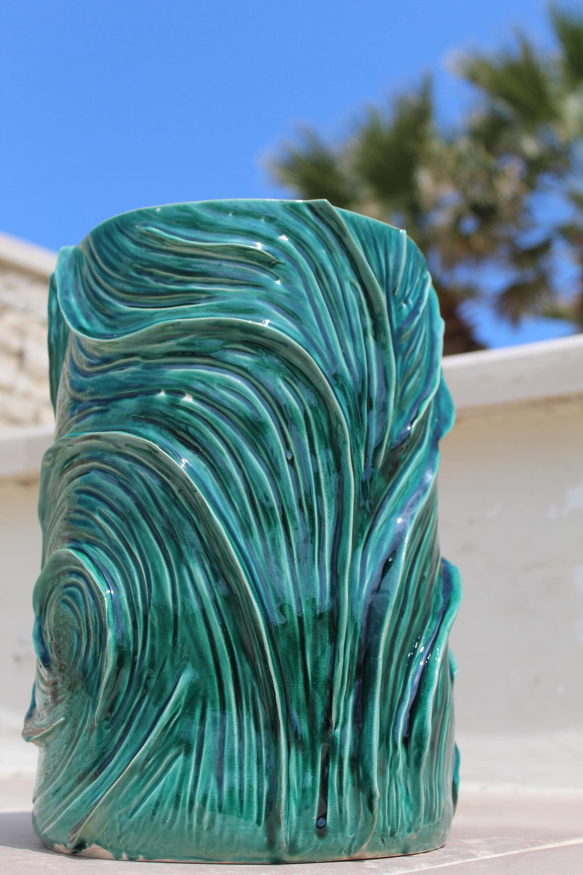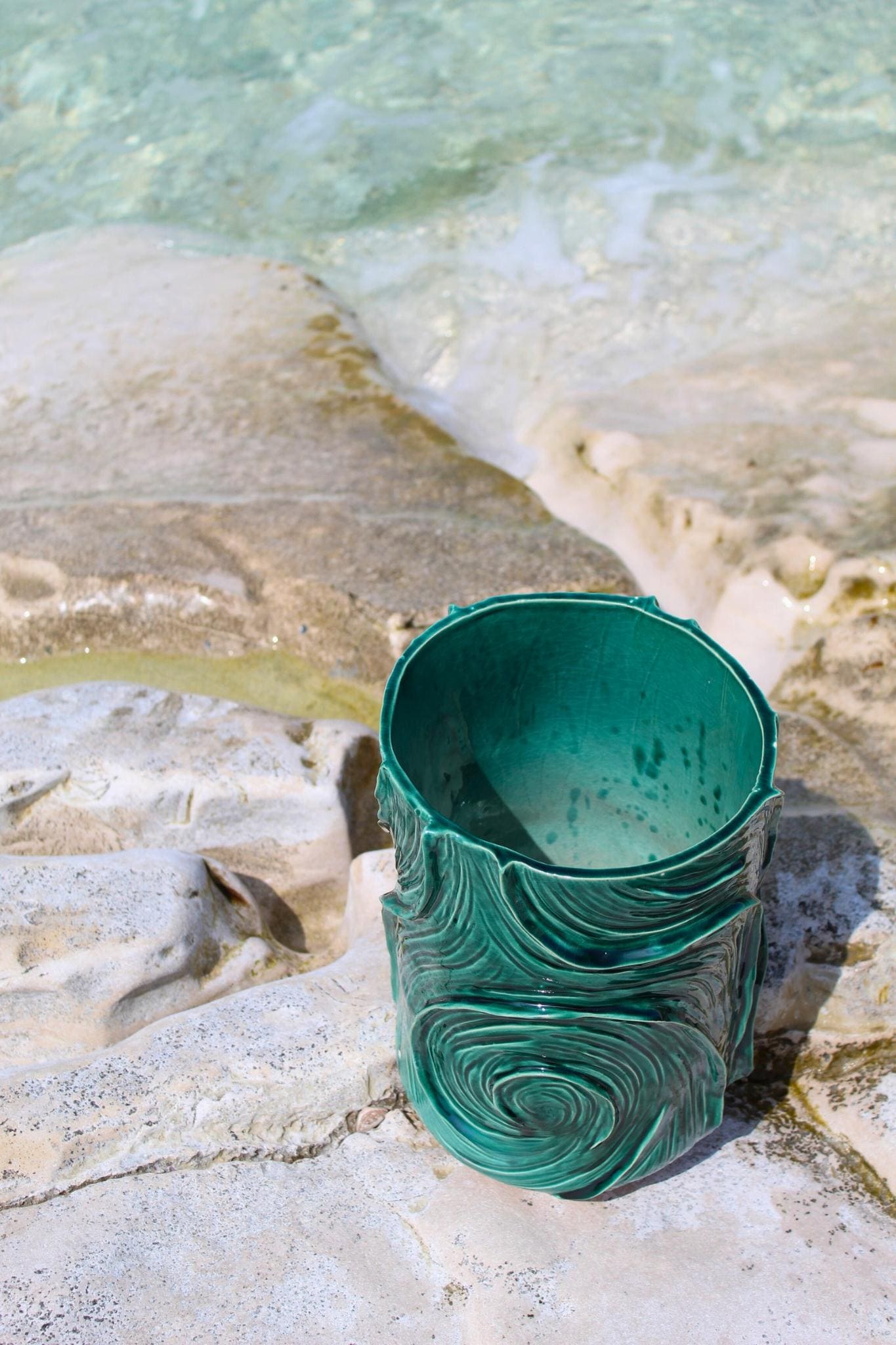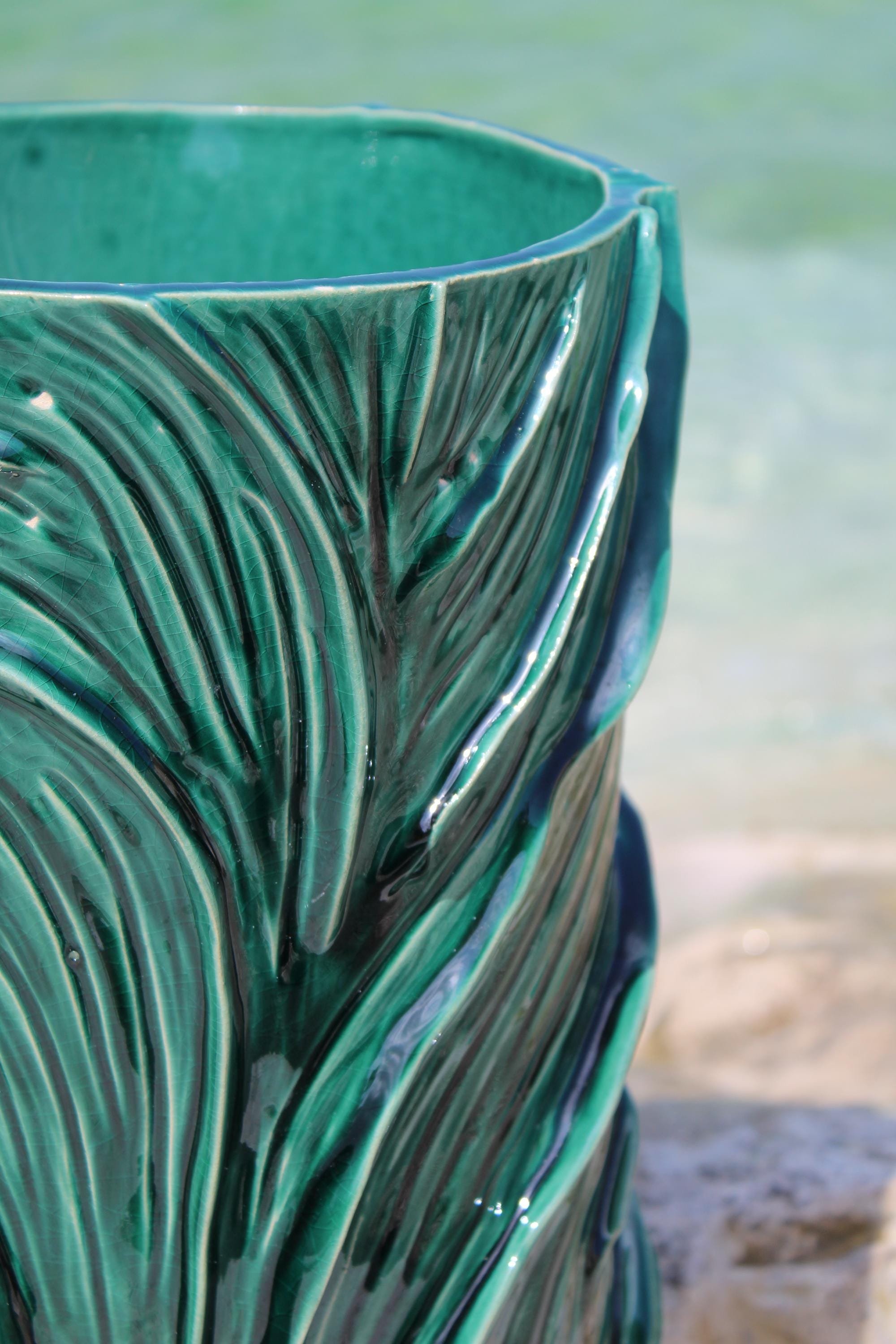 Scilla is a sculptural vase in handcrafted ceramic, characterised by a sinuous surface that recalls the movements of the sea. Handcrafted and enameled in an elegant emerald green, it features waves and swirls that catch the light and create a unique play of reflections.