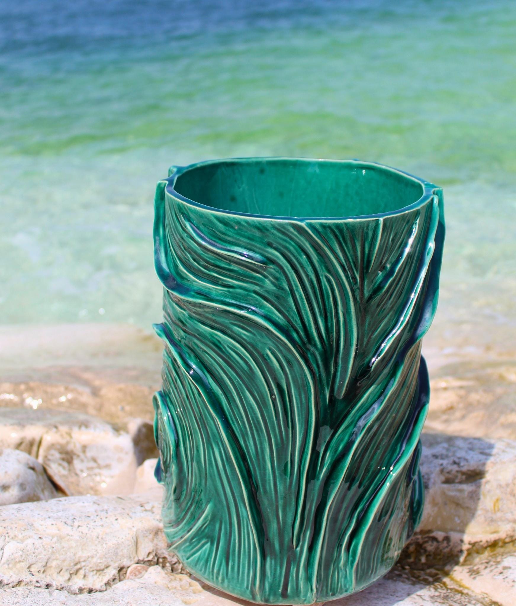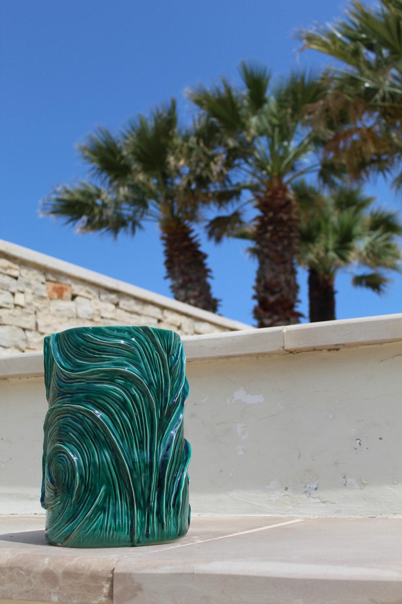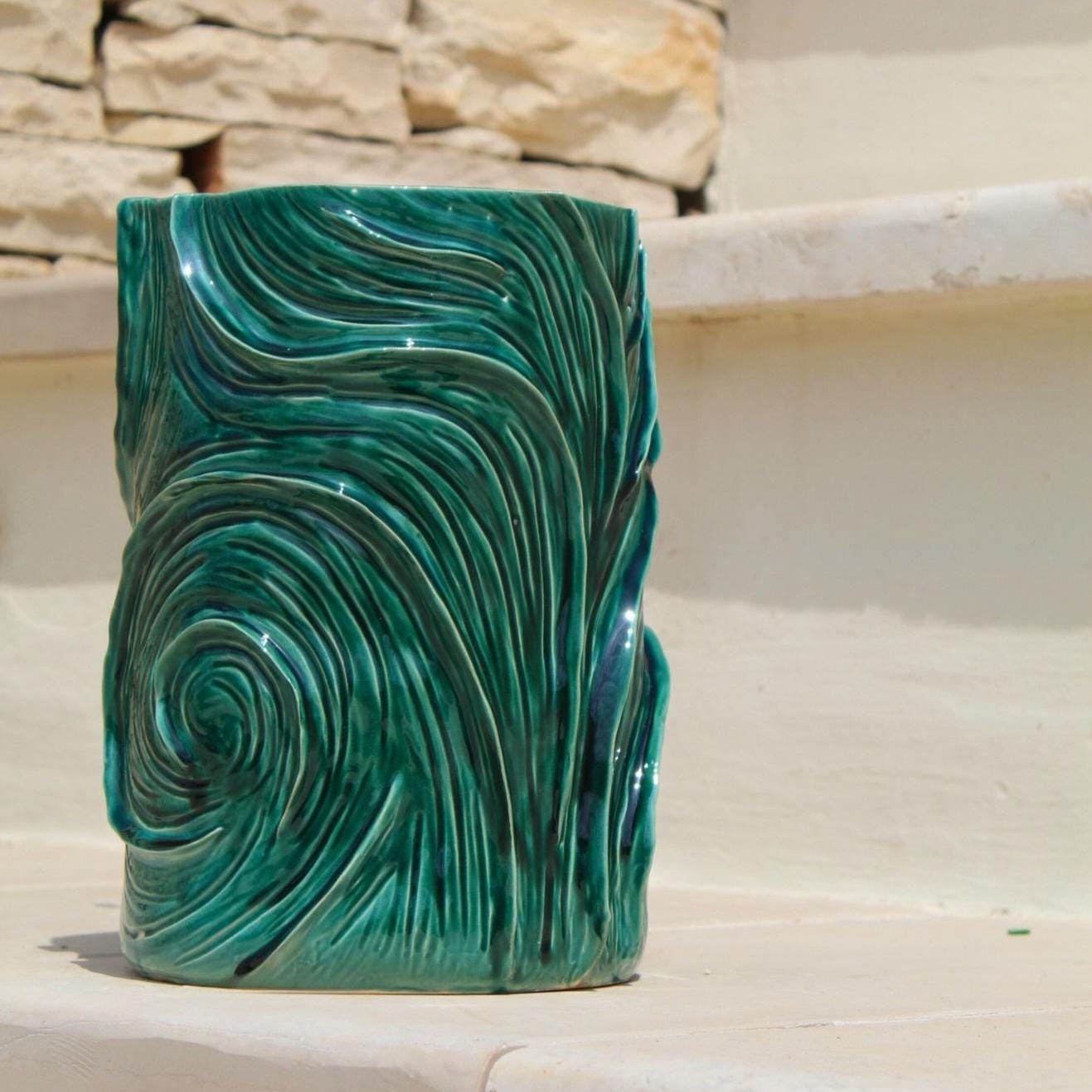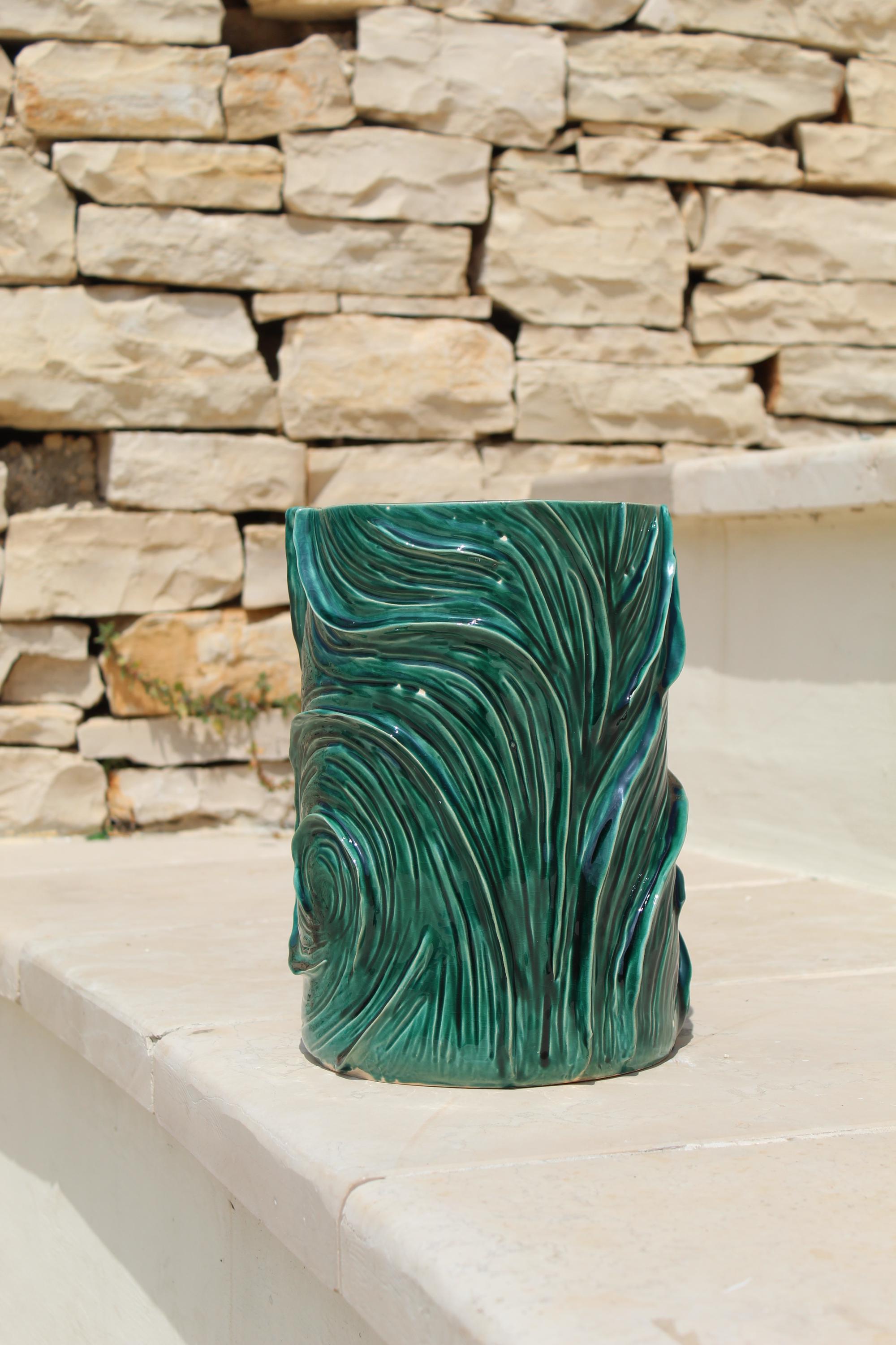 Scilla is a sculptural vase in handcrafted ceramic, characterised by a sinuous surface that recalls the movements of the sea. Handcrafted and enameled in an elegant emerald green, it features waves and swirls that catch the light and create a unique play of reflections.
