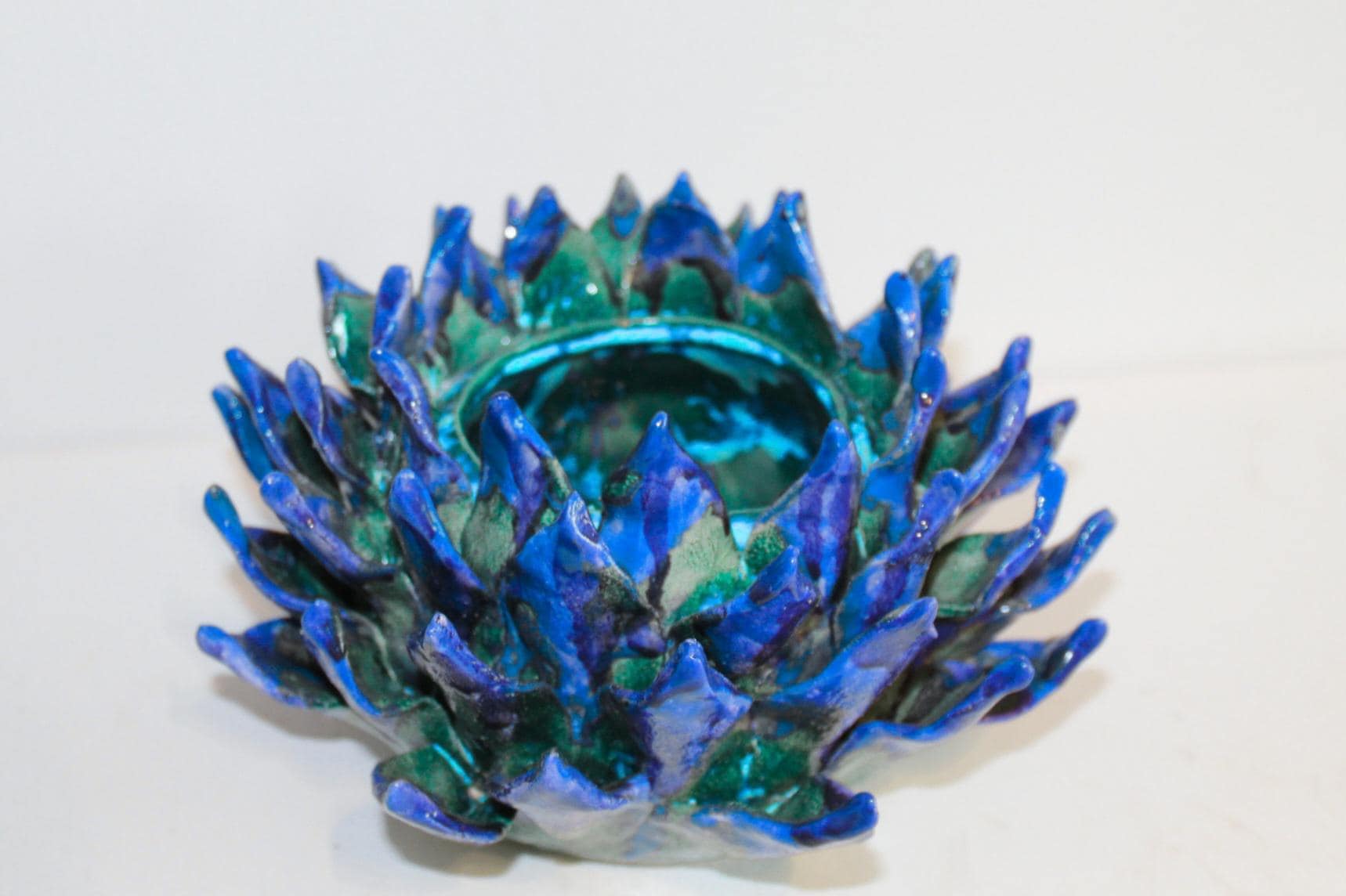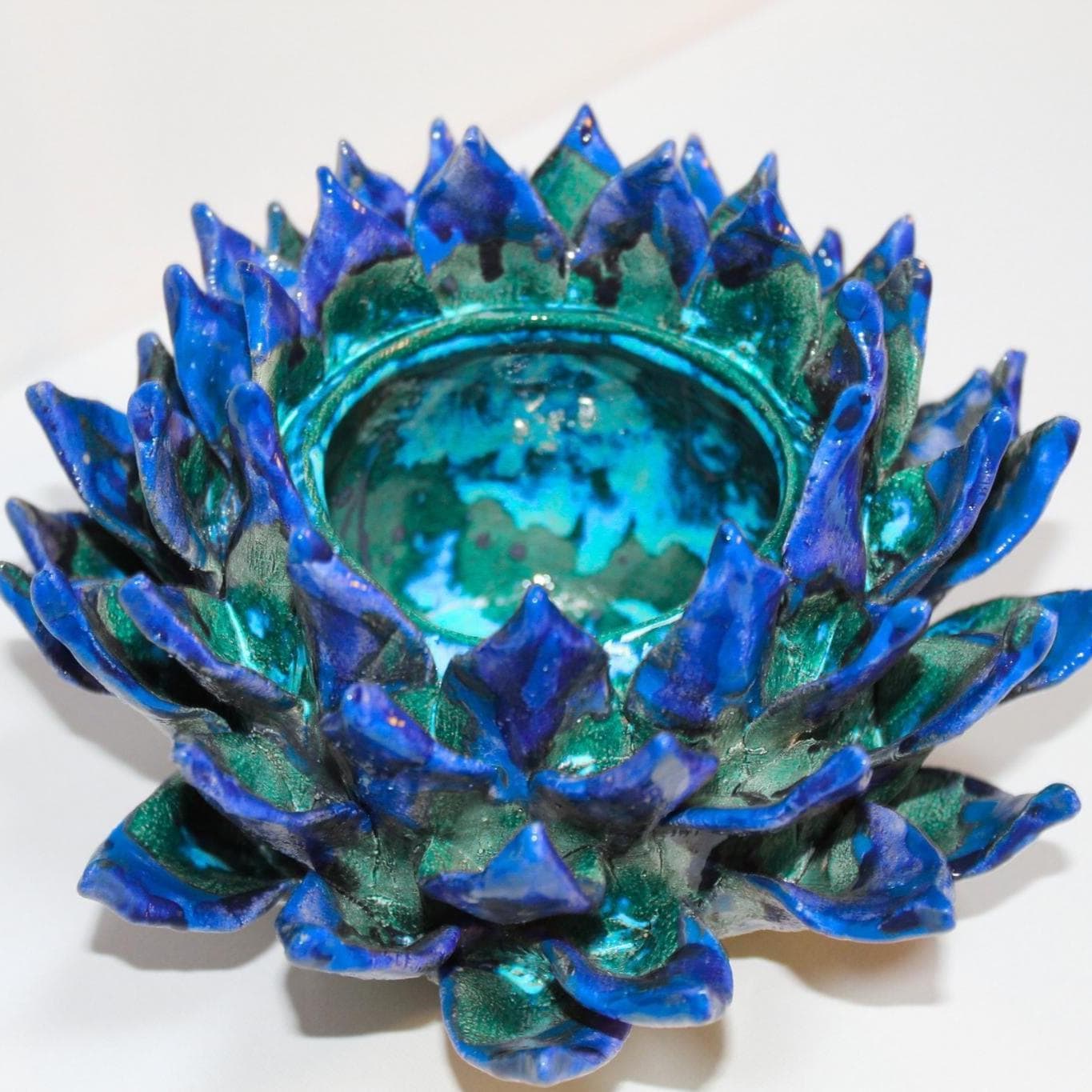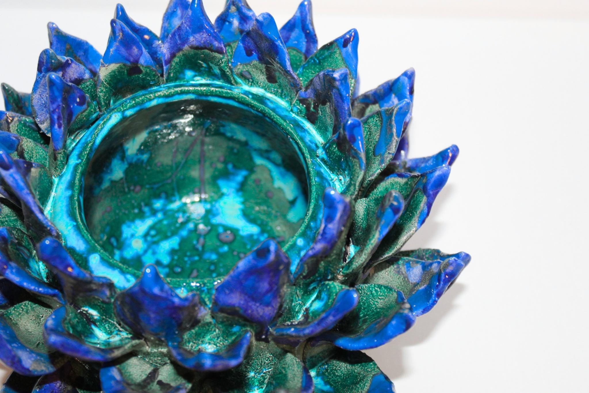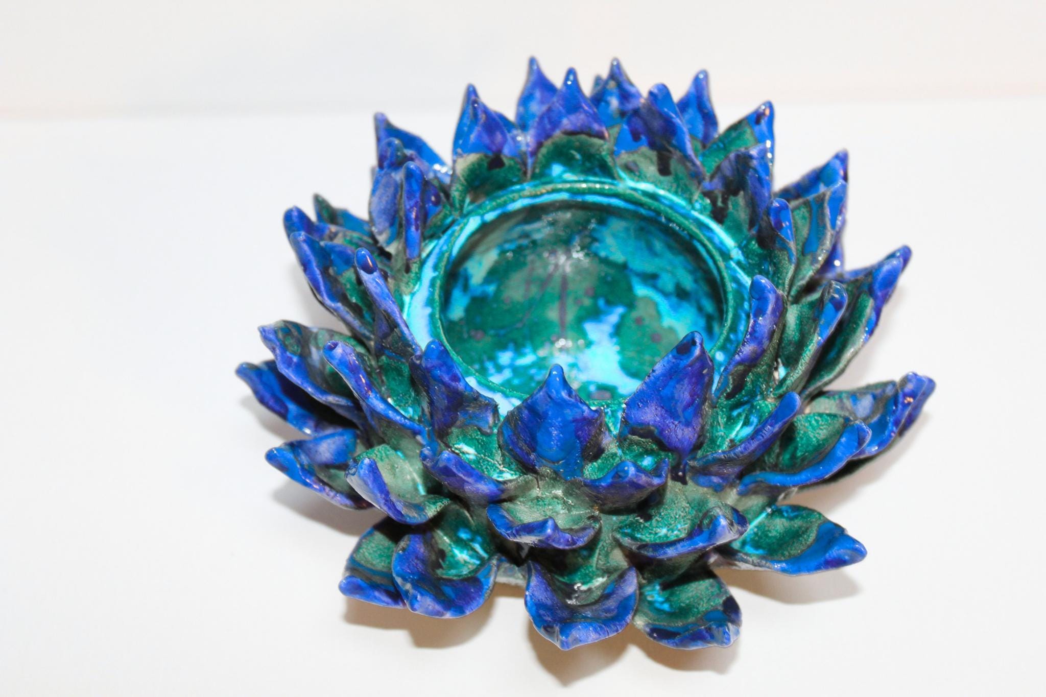 Add a touch of elegance and originality to your home with Ninfea Blu, a refined ceramic vase and candle holder made entirely by hand. This unique piece, with its turquoise blue and green hues, recalls the shape of a blooming water lily: the carefully shaped petals create an ideal space in the center for tealights, votive candles, or small floral arrangements.