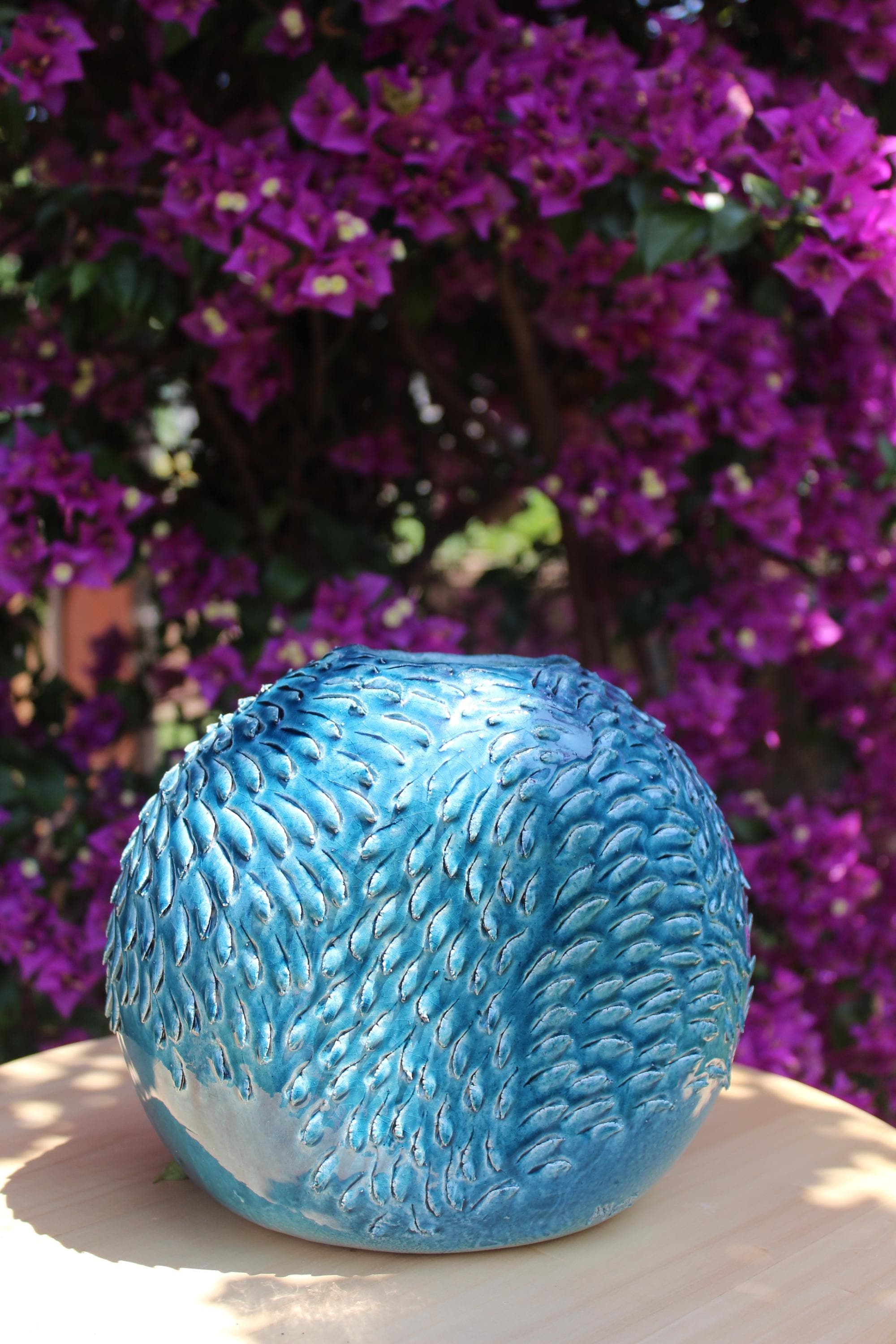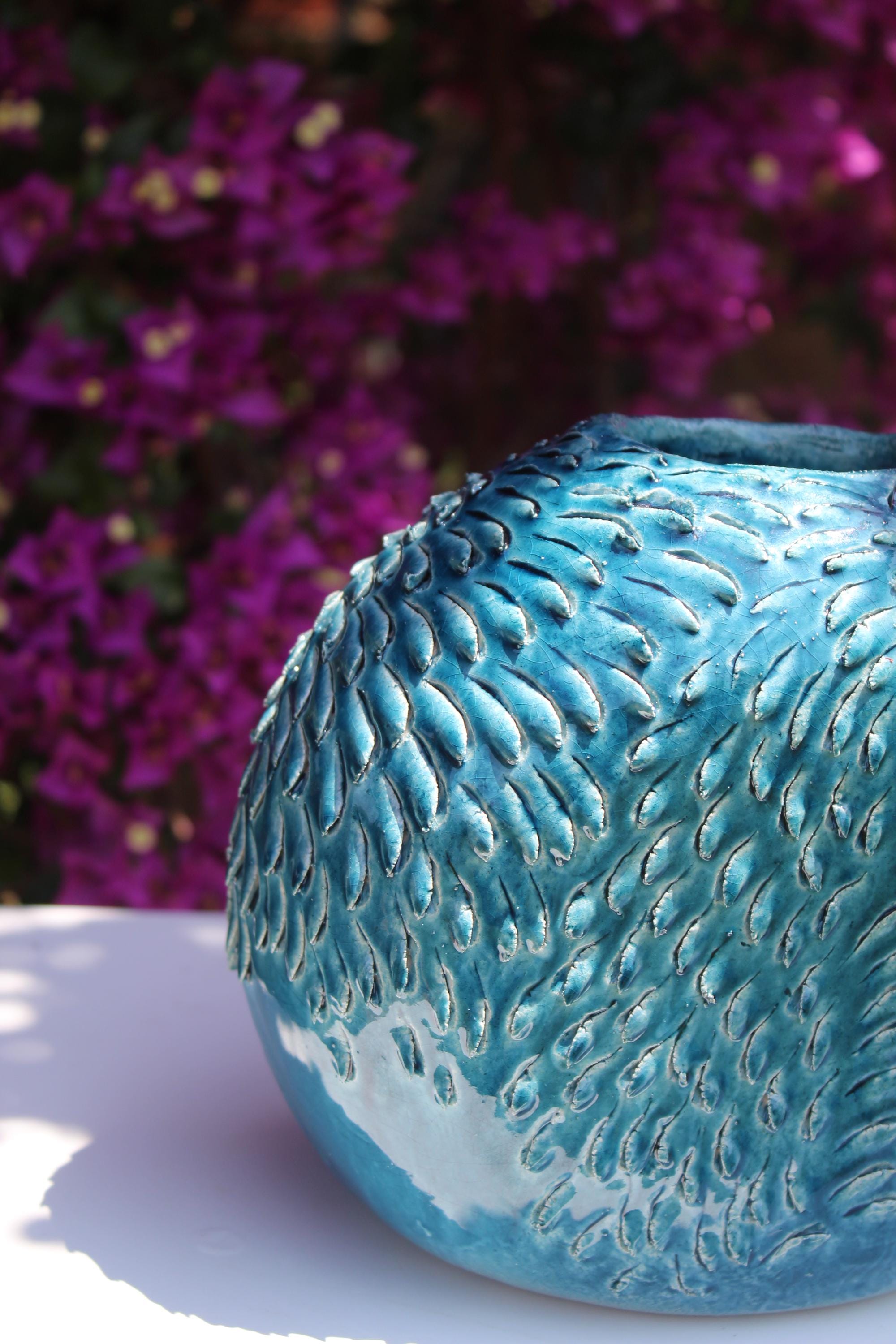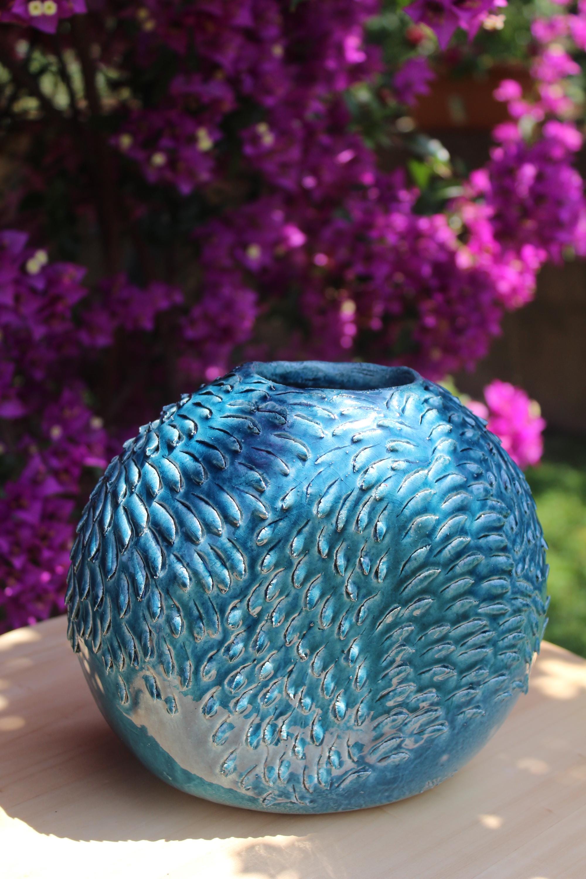Bring a breath of elegance into your home with Zephyra, a completely handmade ceramic vase. Its organic texture recalls the movement of the wind on the water, enhanced by a vibrant turquoise finish.