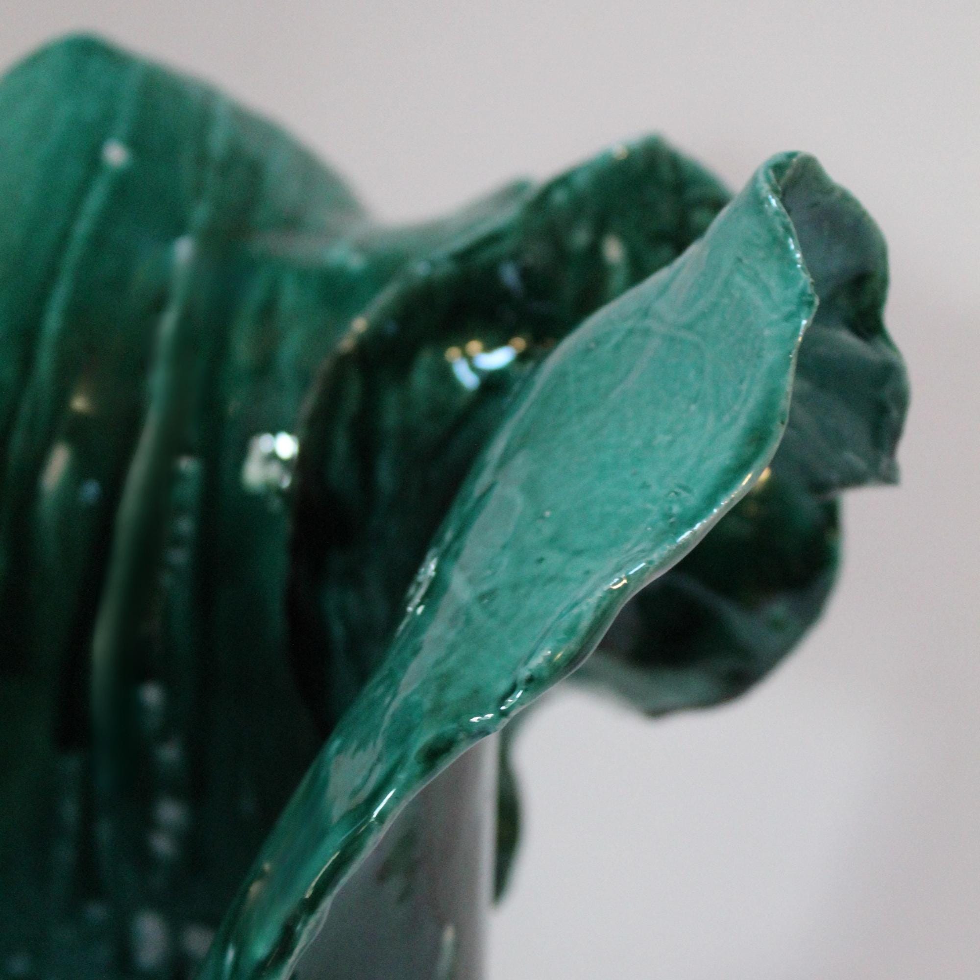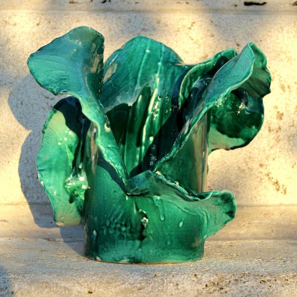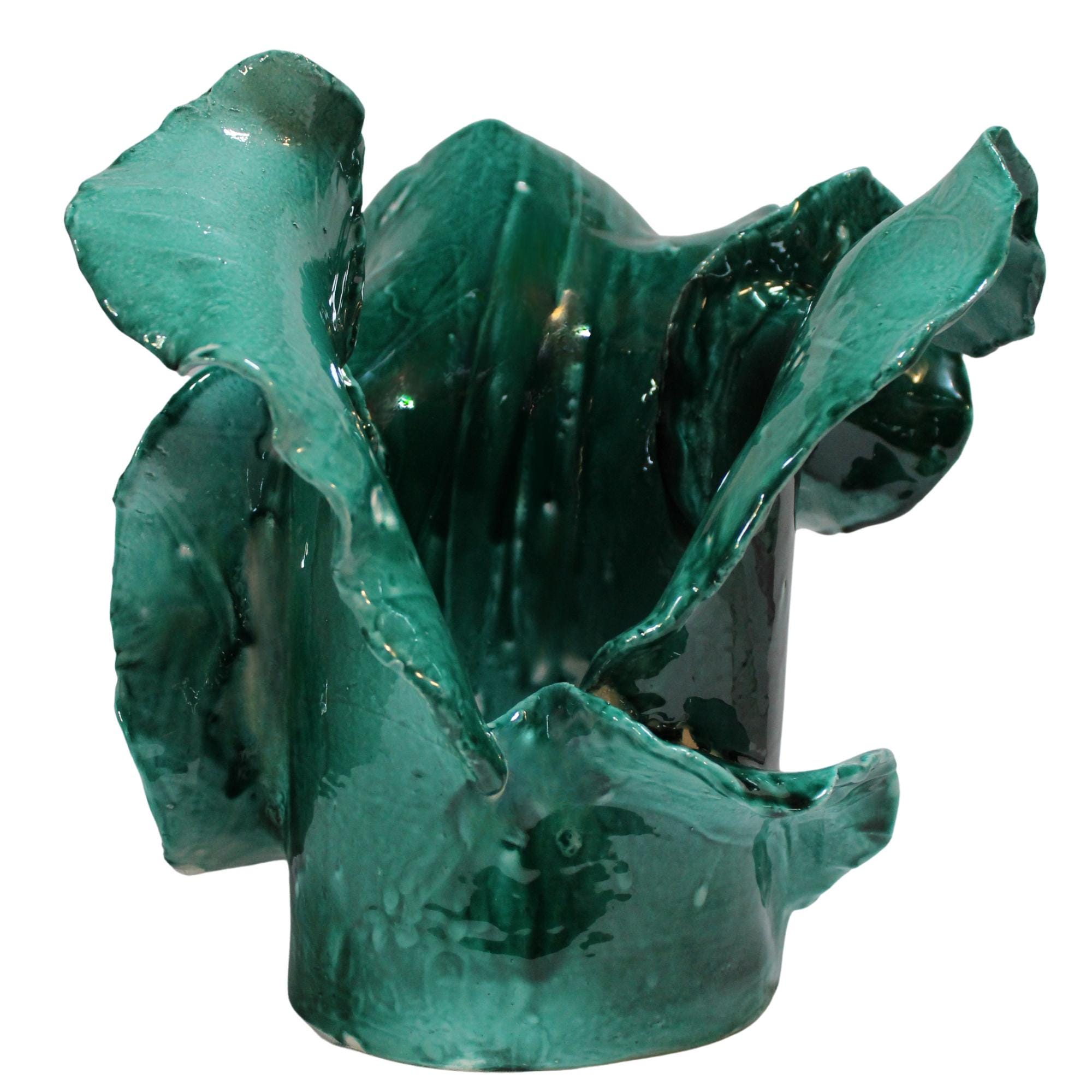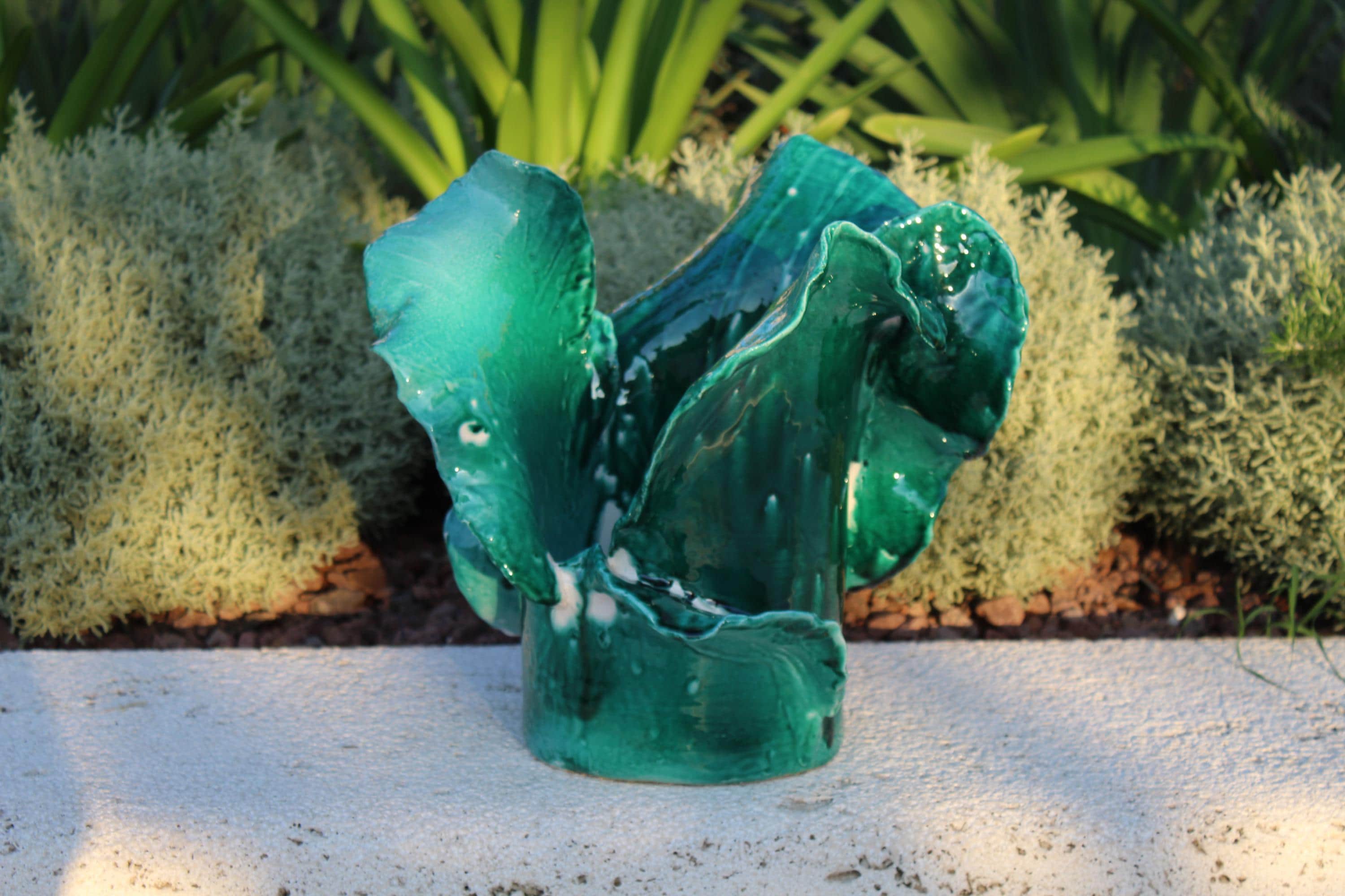 Let yourself be enchanted by the organic charm of Dafne, a ceramic vase crafted entirely by hand. Its soft, irregular shapes are reminiscent of petals blowing in the wind, while the glossy emerald green finish elegantly captures and reflects the light. Measuring 38 cm wide and 40 cm tall, this unique piece is the perfect centerpiece in a living room, entryway, or creative studio. Ideal both as a decorative vase and a contemporary sculpture, it brings a touch of nature and timeless art to your home.