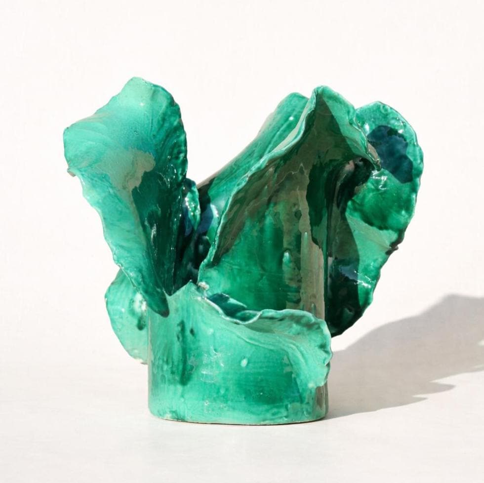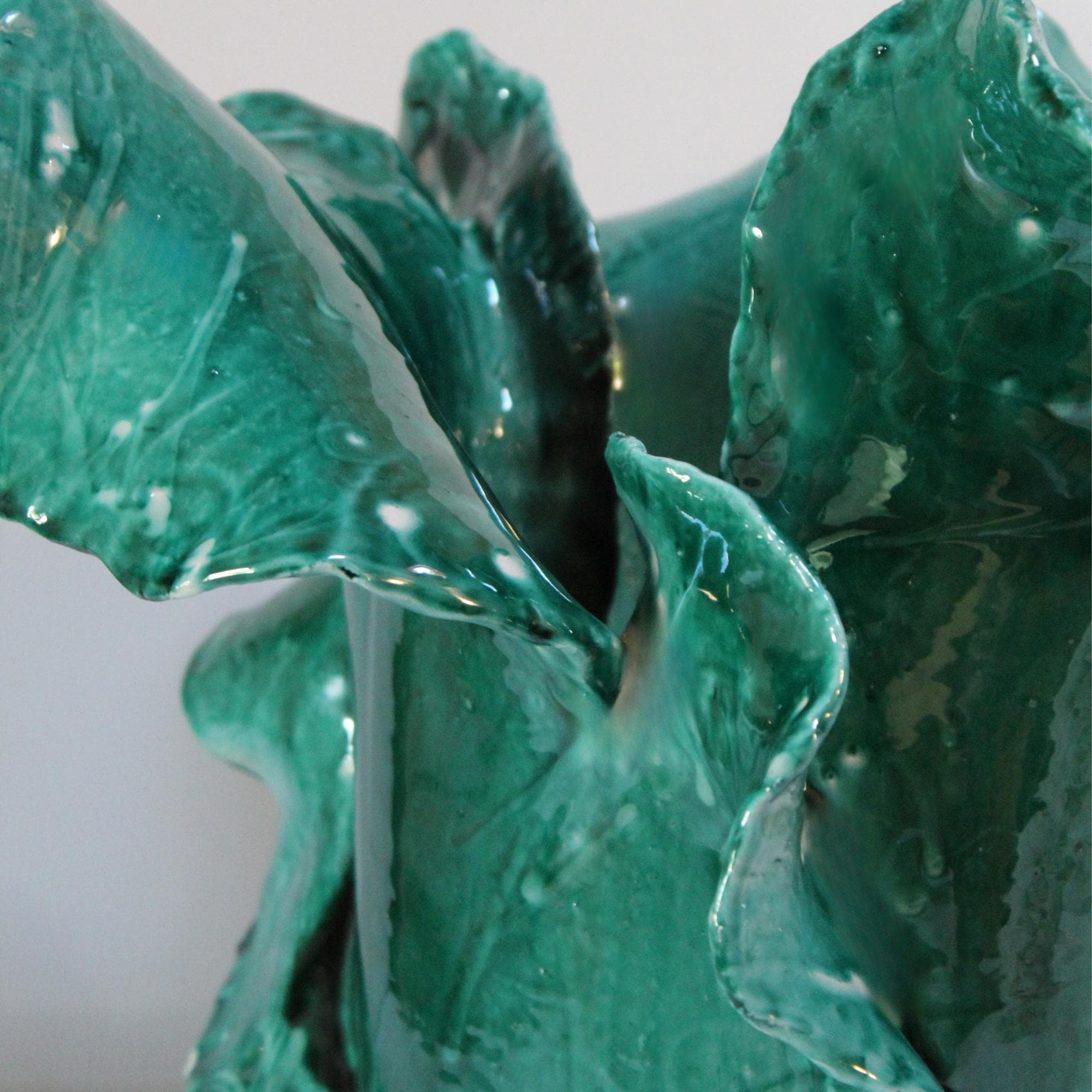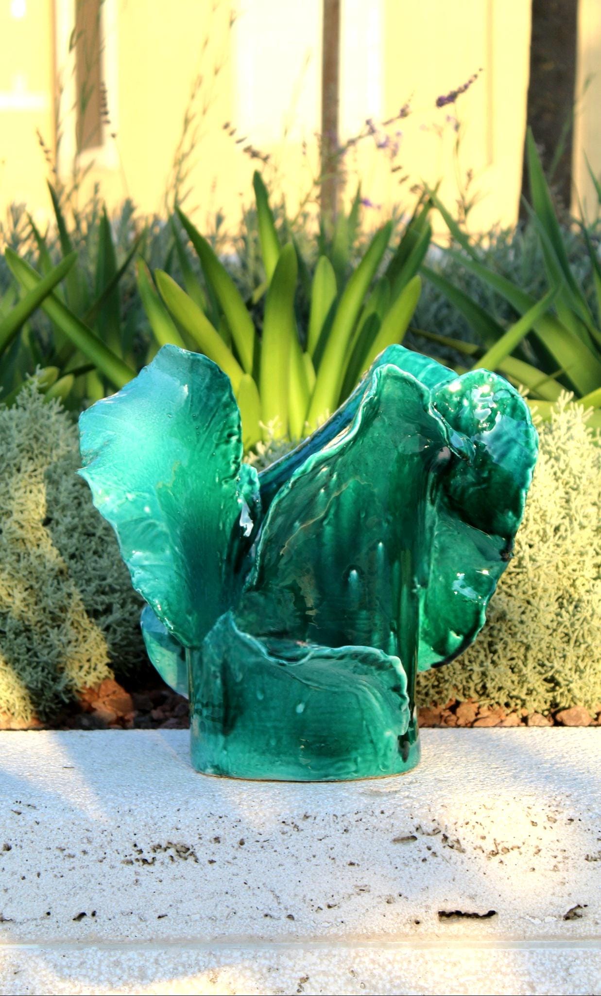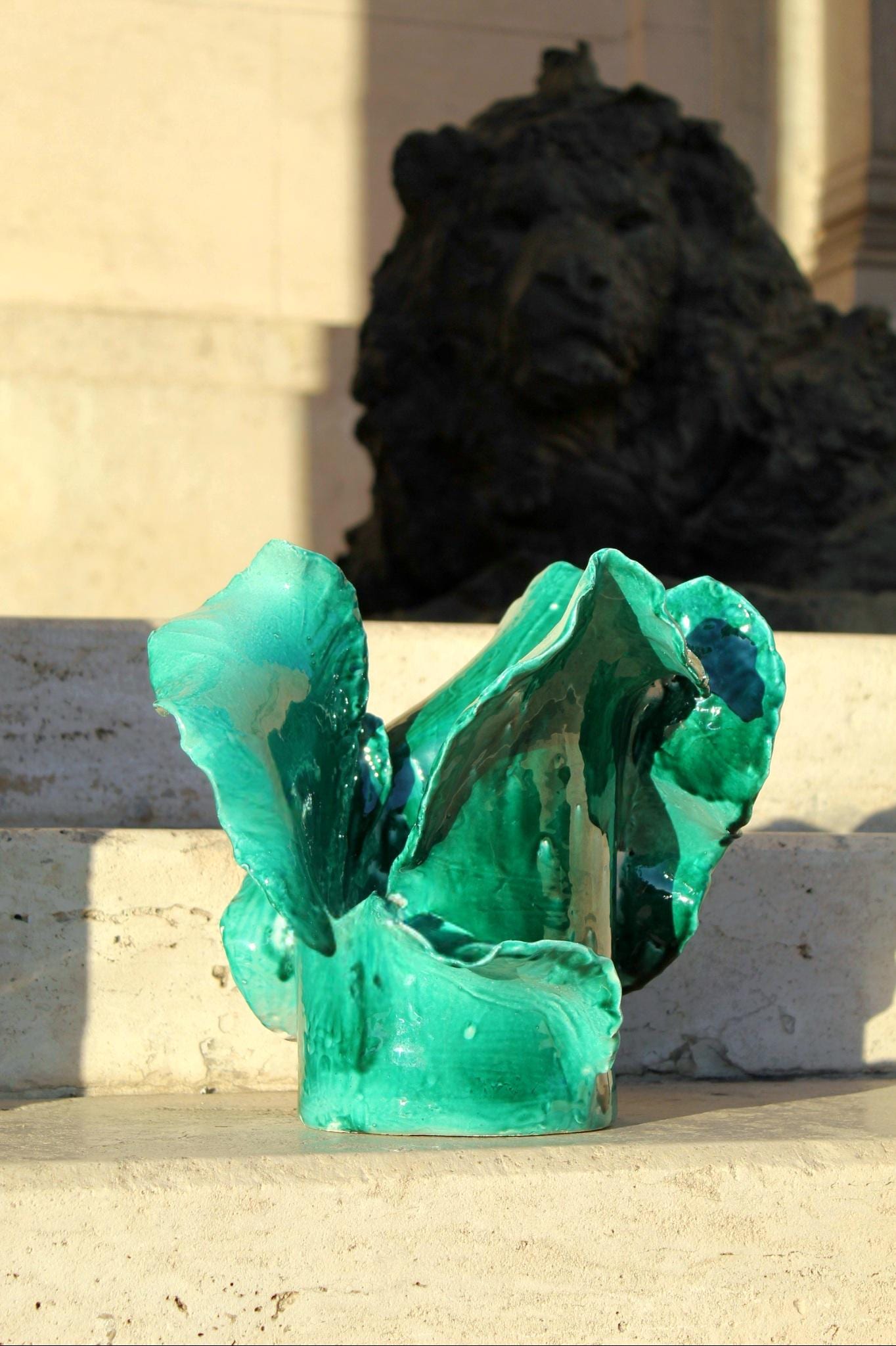 Let yourself be enchanted by the organic charm of Dafne, a ceramic vase crafted entirely by hand. Its soft, irregular shapes are reminiscent of petals blowing in the wind, while the glossy emerald green finish elegantly captures and reflects the light. Measuring 38 cm wide and 40 cm tall, this unique piece is the perfect centerpiece in a living room, entryway, or creative studio. Ideal both as a decorative vase and a contemporary sculpture, it brings a touch of nature and timeless art to your home.