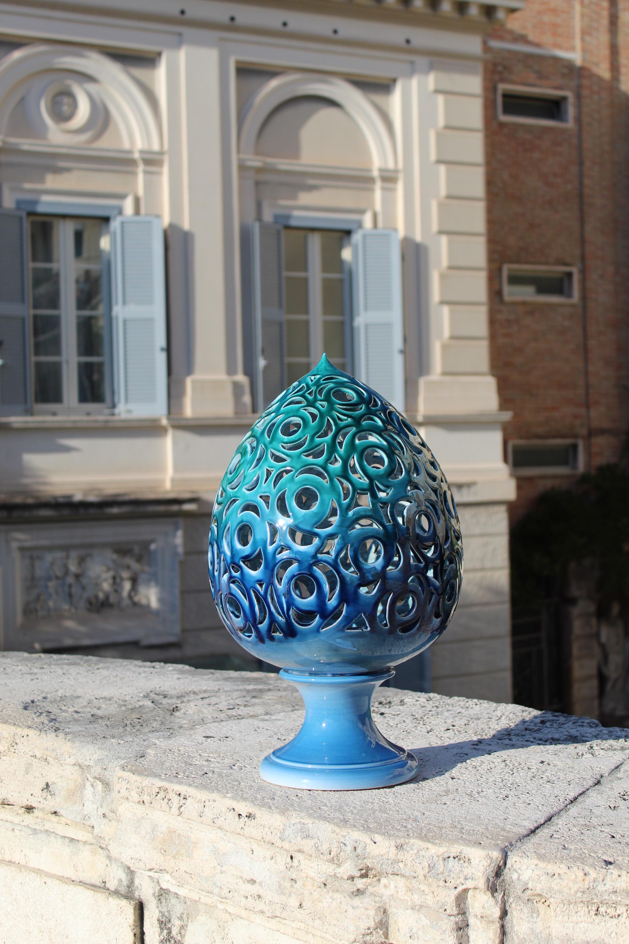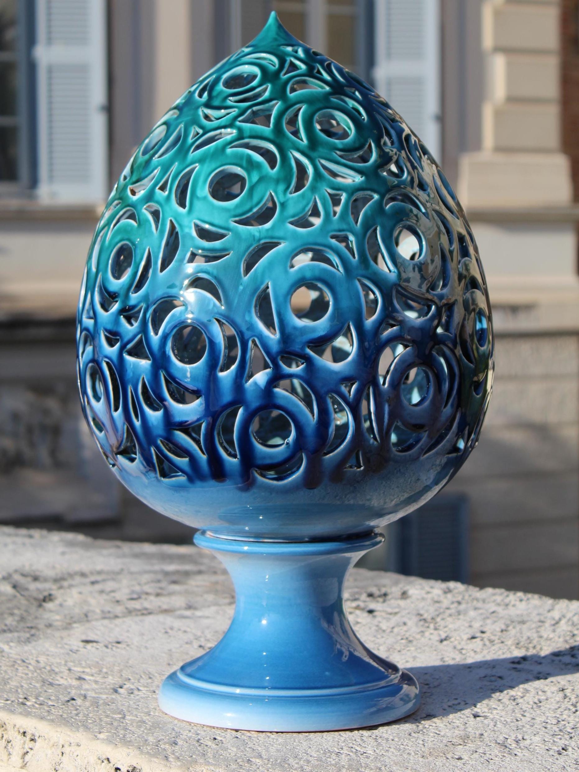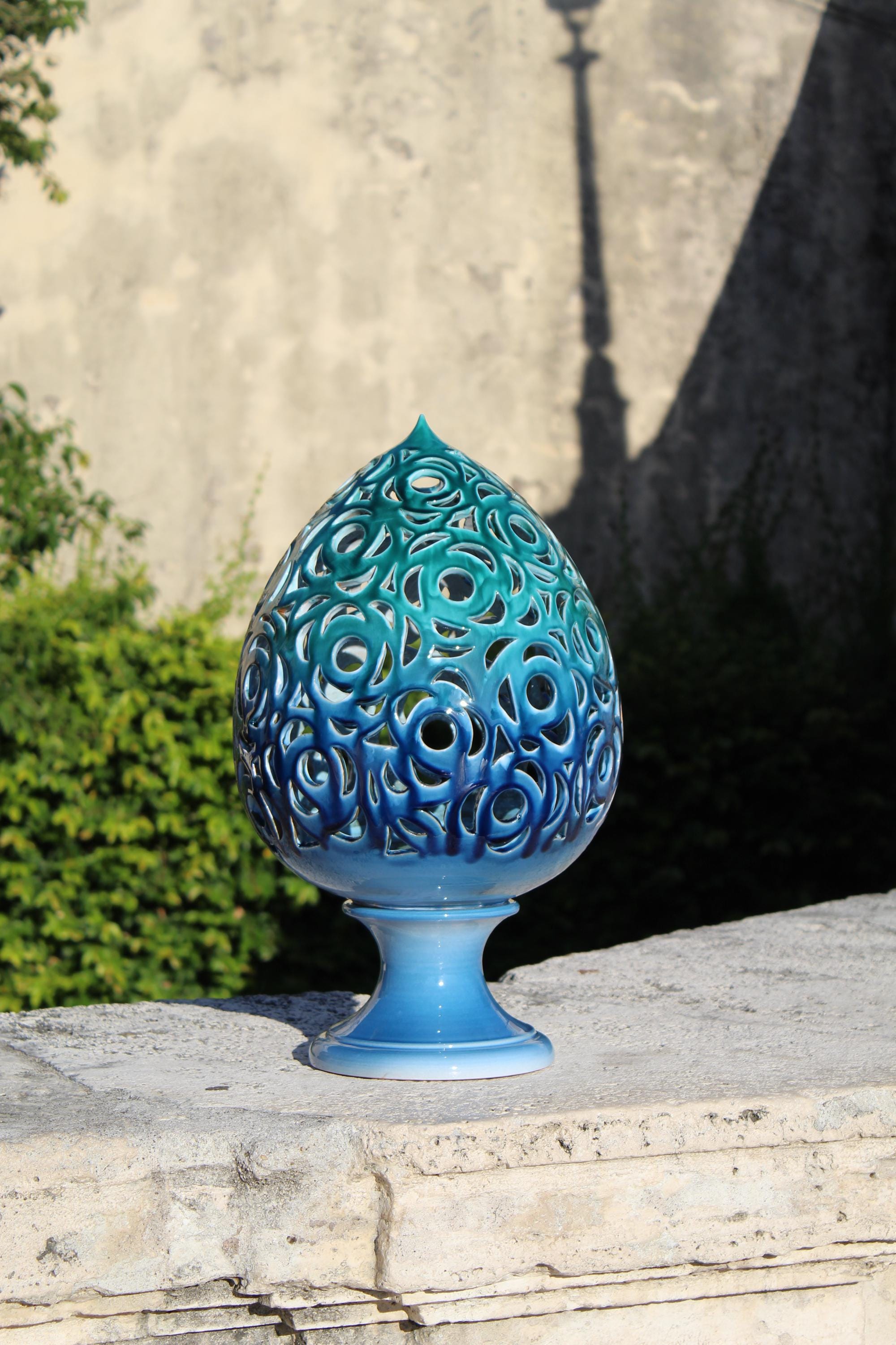 Astra is a handcrafted ceramic lantern inspired by the dialogue between light and matter. Each perforation is hand-shaped, allowing the light to project marine designs and reflections onto the walls. Its blue and turquoise hues evoke the sea at night, while its elegant shape and meticulous details make it a unique piece, capable of transforming any room into an intimate and evocative space. Perfect as a mood light, a centerpiece, or a refined gift, Astra embodies the magic of Italian craftsmanship: a small constellation of ceramic and light. Dimensions: [H 57 x W 30 ] Material: glazed ceramic, hand-worked and hand-carved Handmade in Italy 🇮🇹