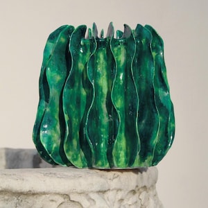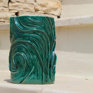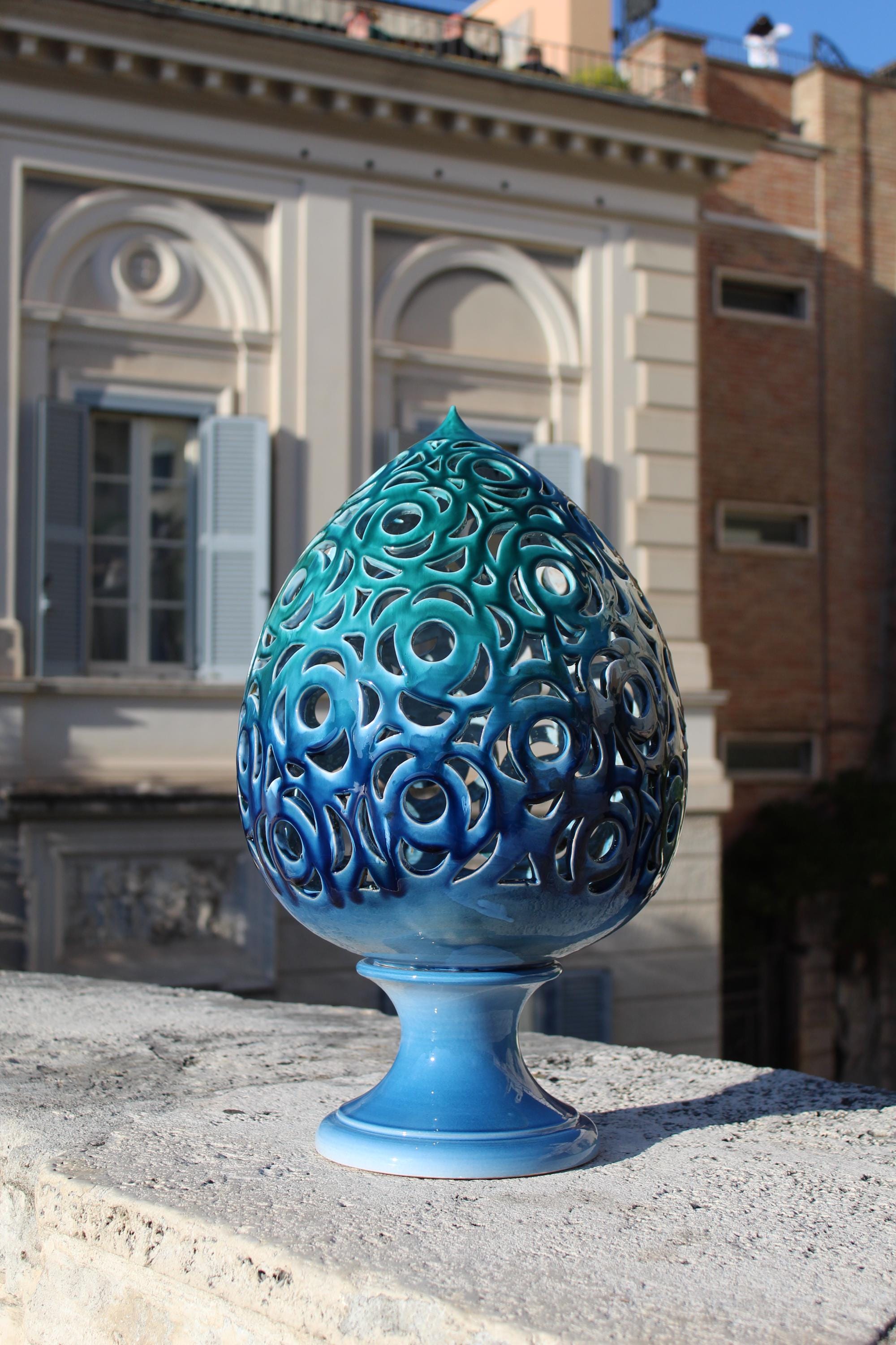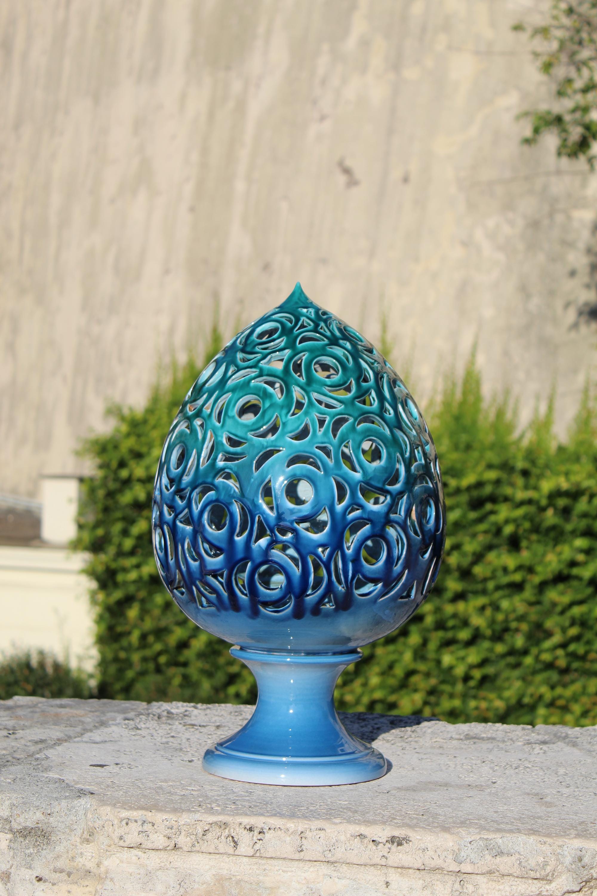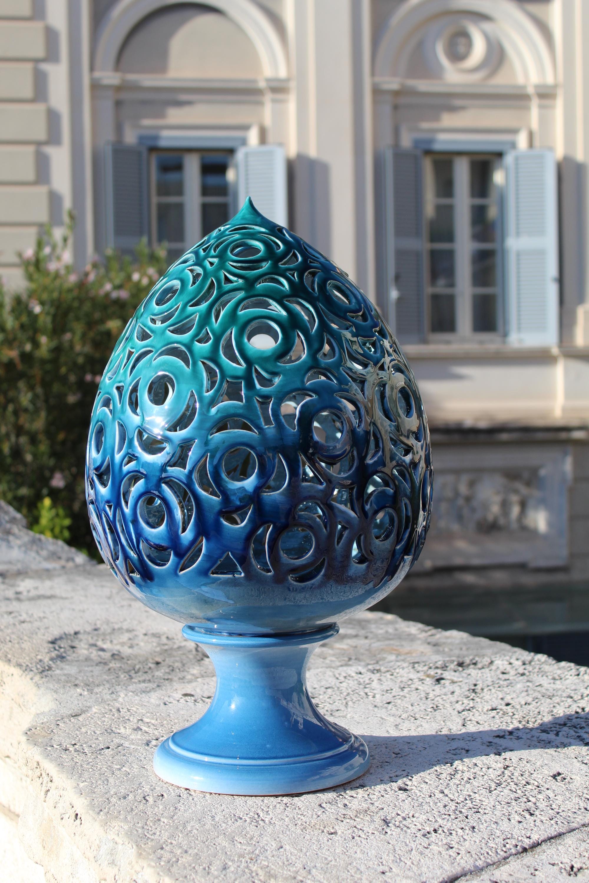 Astra is a handcrafted ceramic lantern inspired by the dialogue between light and matter. Each perforation is hand-shaped, allowing the light to project marine designs and reflections onto the walls. Its blue and turquoise hues evoke the sea at night, while its elegant shape and meticulous details make it a unique piece, capable of transforming any room into an intimate and evocative space. Perfect as a mood light, a centerpiece, or a refined gift, Astra embodies the magic of Italian craftsmanship: a small constellation of ceramic and light. Dimensions: [H 57 x W 30 ] Material: glazed ceramic, hand-worked and hand-carved Handmade in Italy 🇮🇹