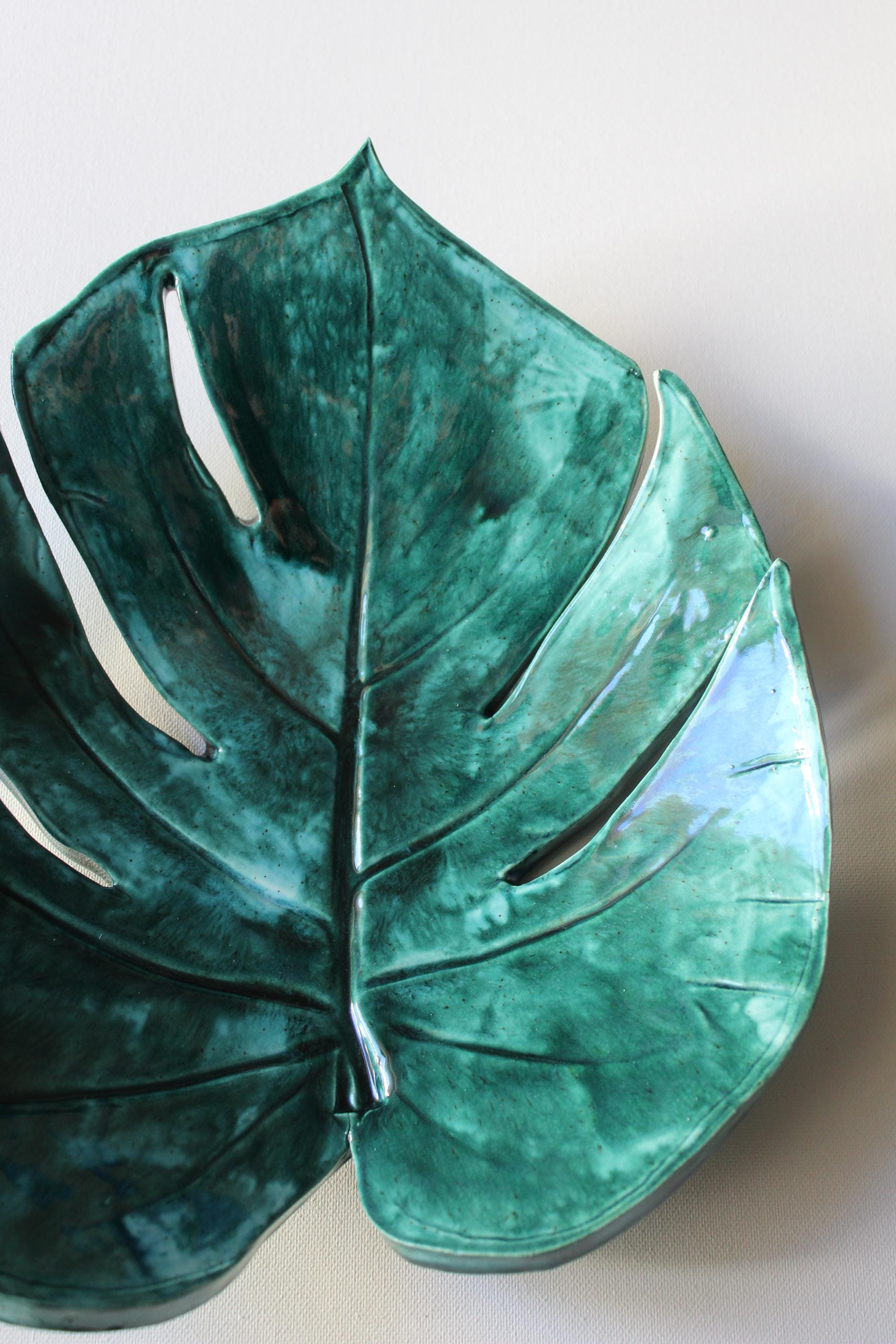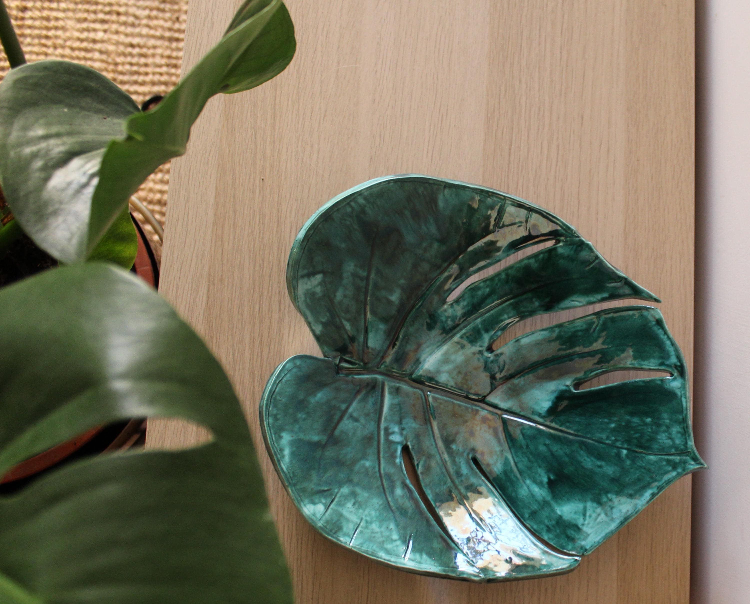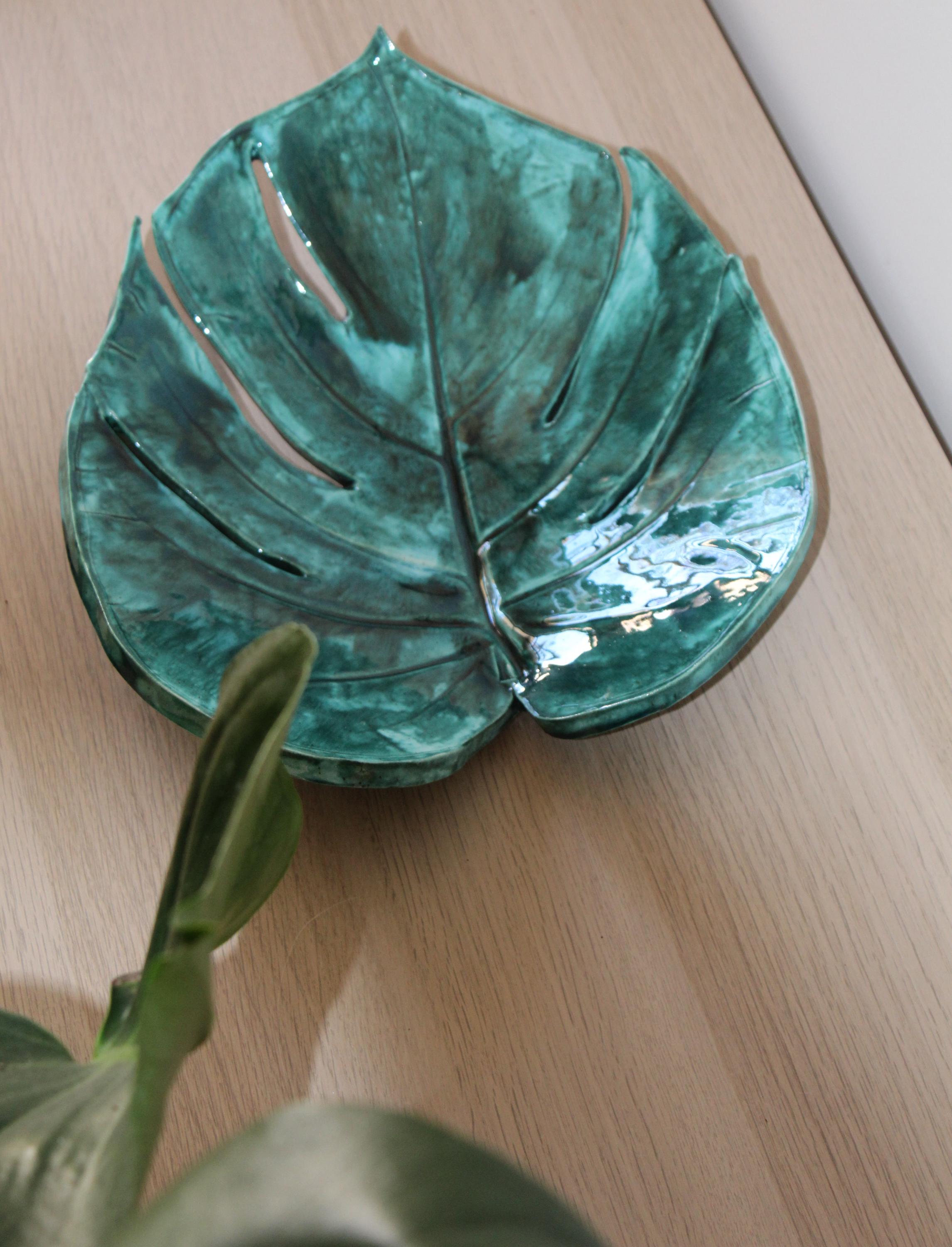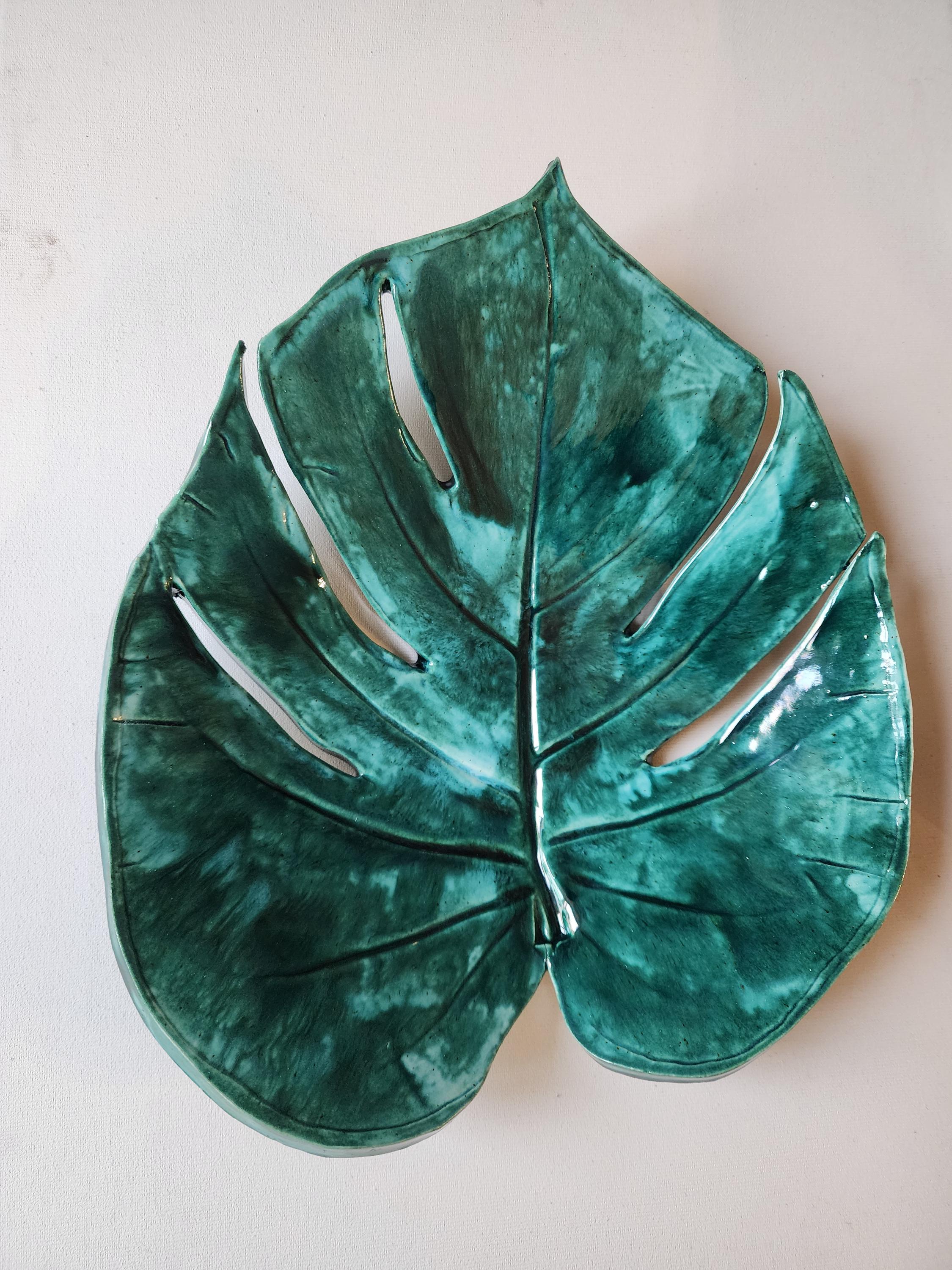 This Monstera Deliciosa leaf is my own handcrafted creation, made entirely by hand in glazed ceramic. Every detail is unique: the sinuous shape, the natural openings and the shades of intense green obtained with effect glazes applied in layers.