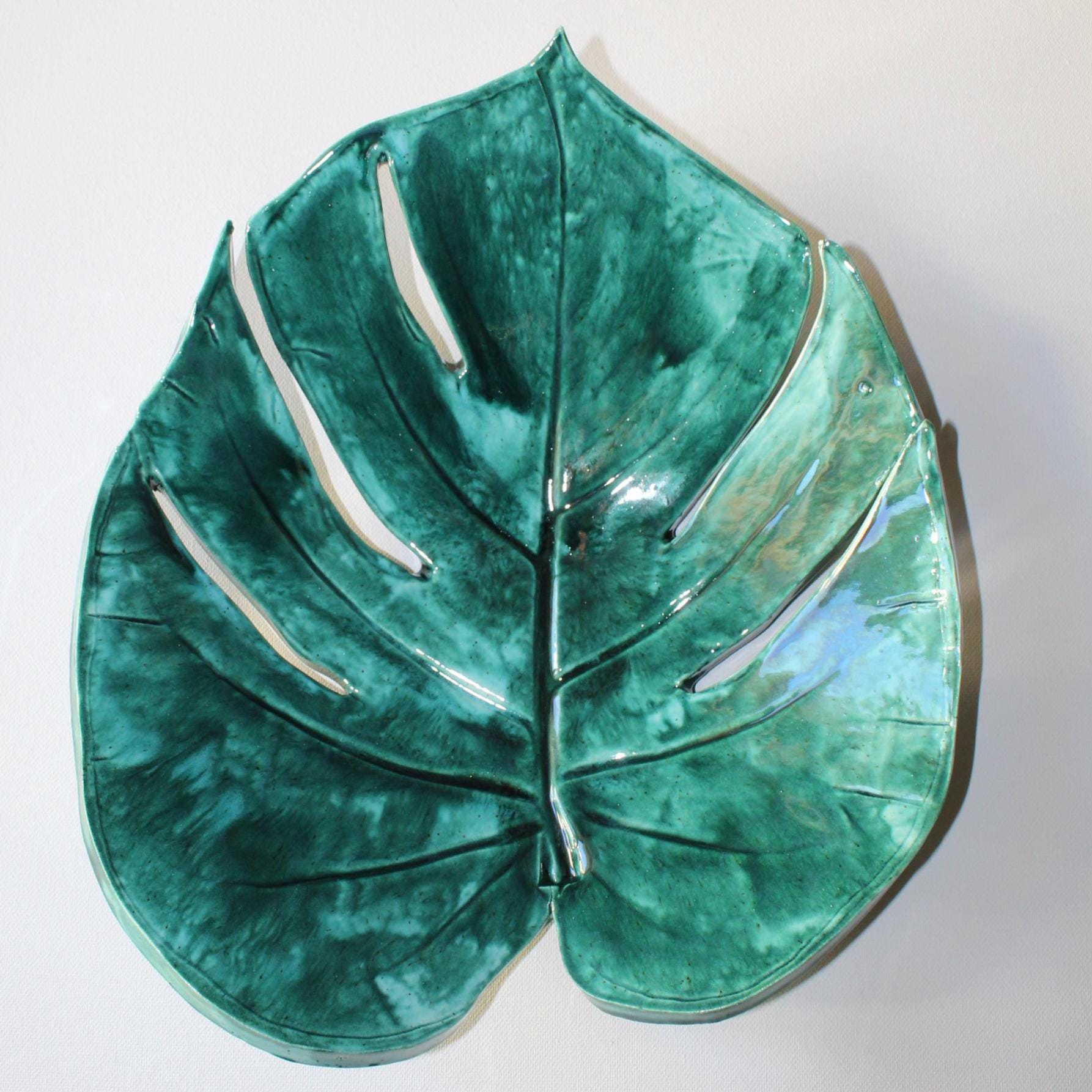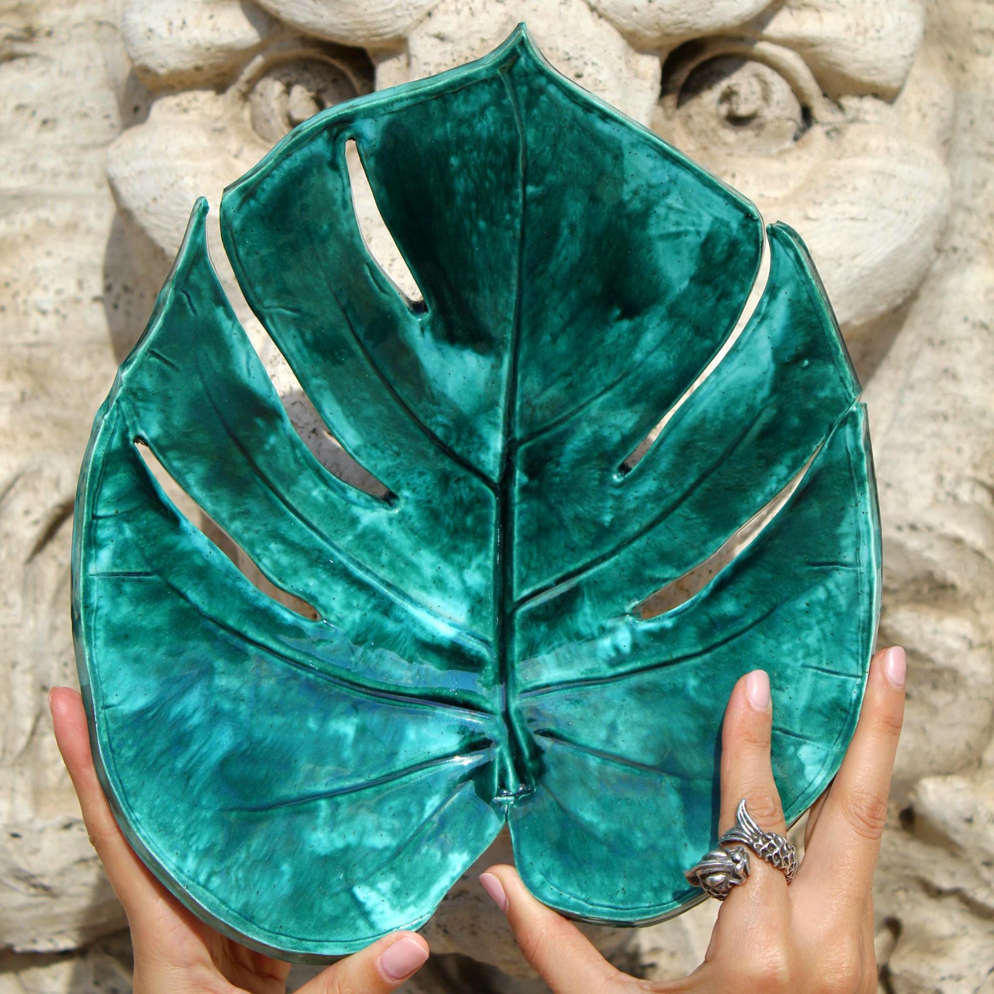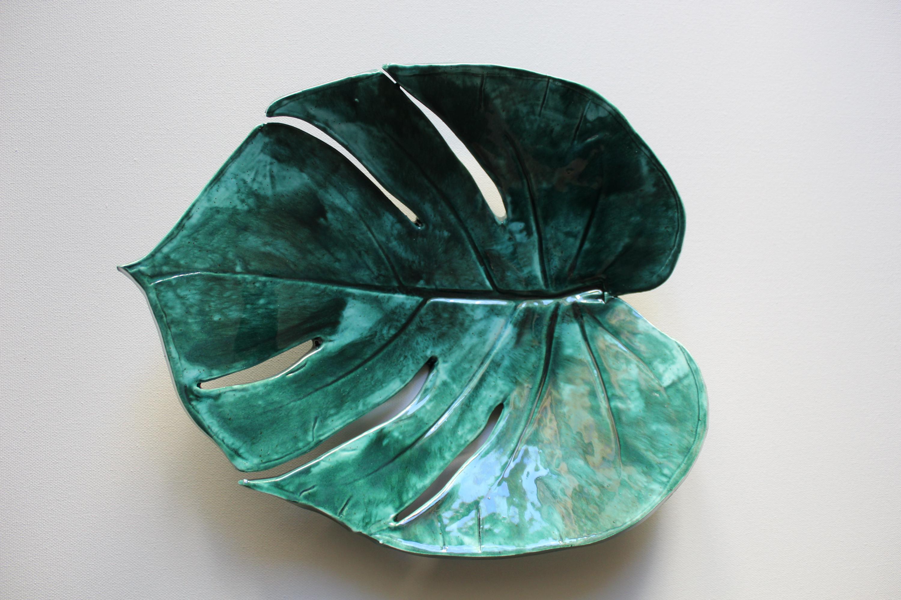 This Monstera Deliciosa leaf is my own handcrafted creation, made entirely by hand in glazed ceramic. Every detail is unique: the sinuous shape, the natural openings and the shades of intense green obtained with effect glazes applied in layers.