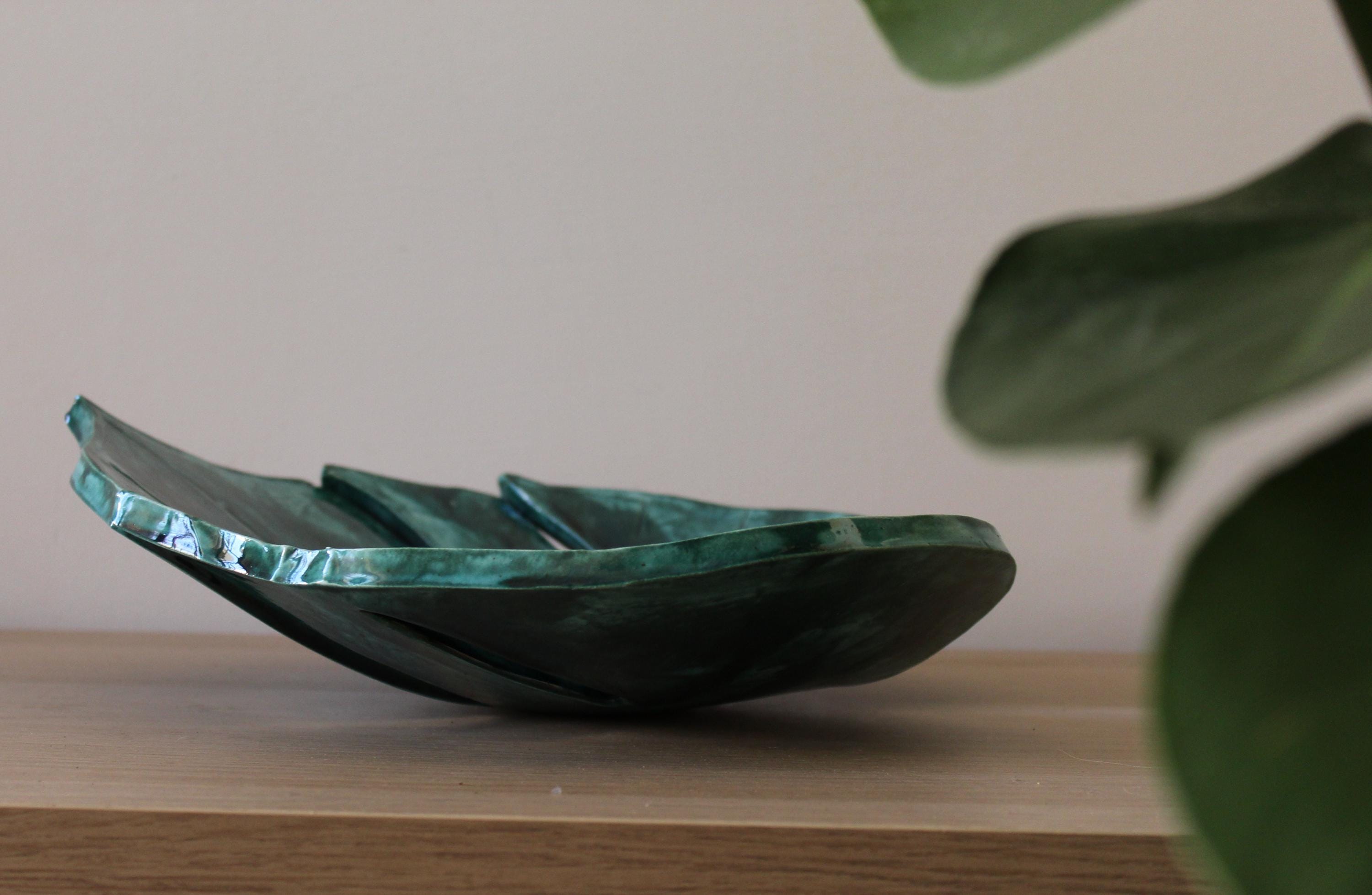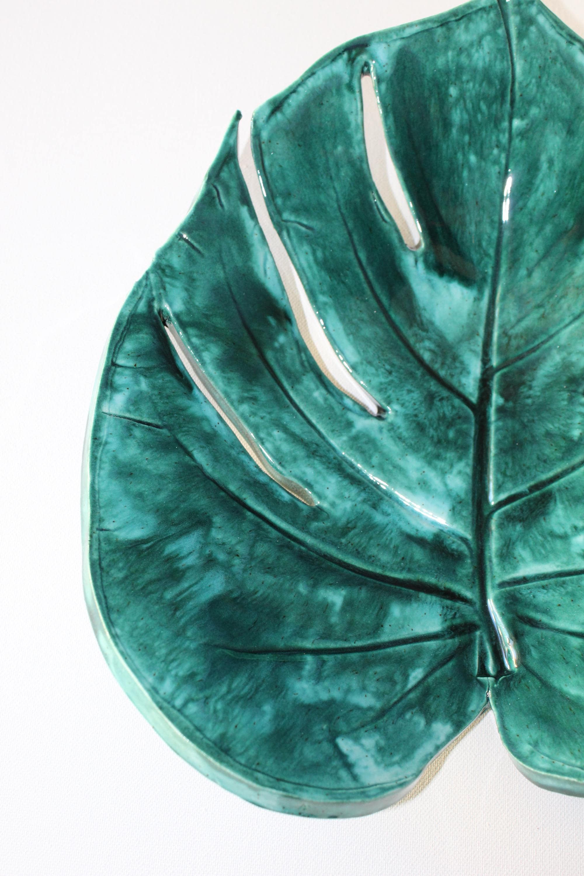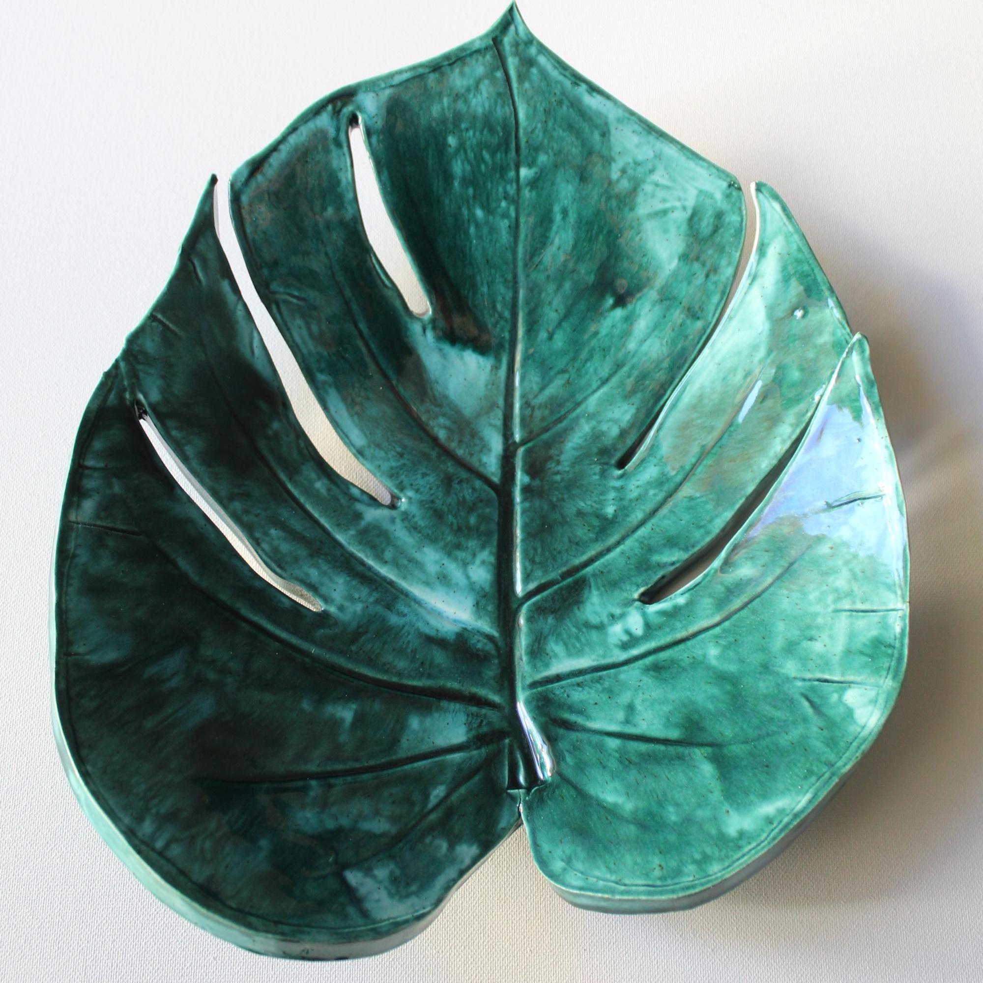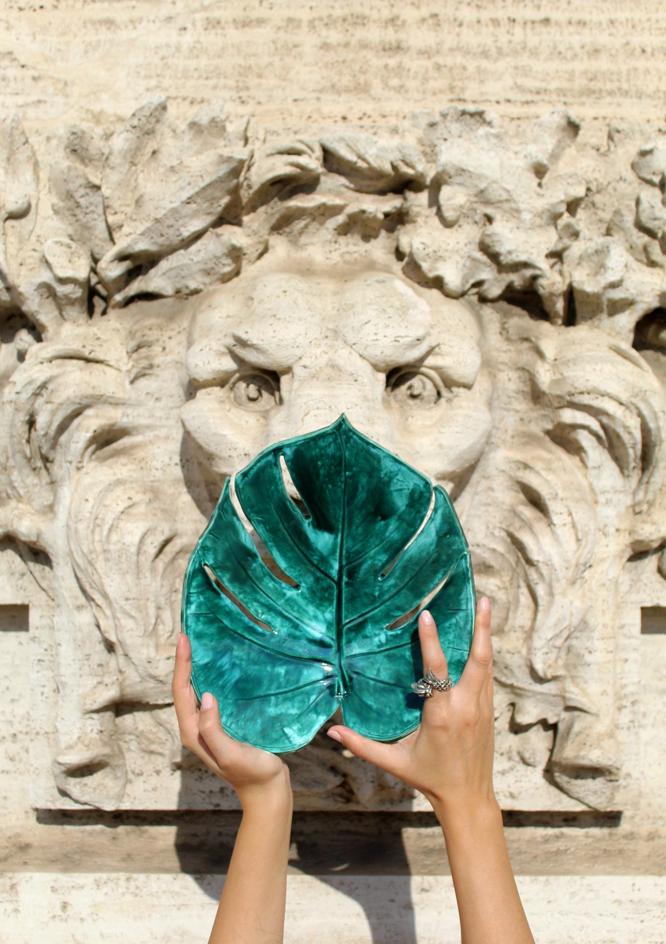 This Monstera Deliciosa leaf is my own handcrafted creation, made entirely by hand in glazed ceramic. Every detail is unique: the sinuous shape, the natural openings and the shades of intense green obtained with effect glazes applied in layers.