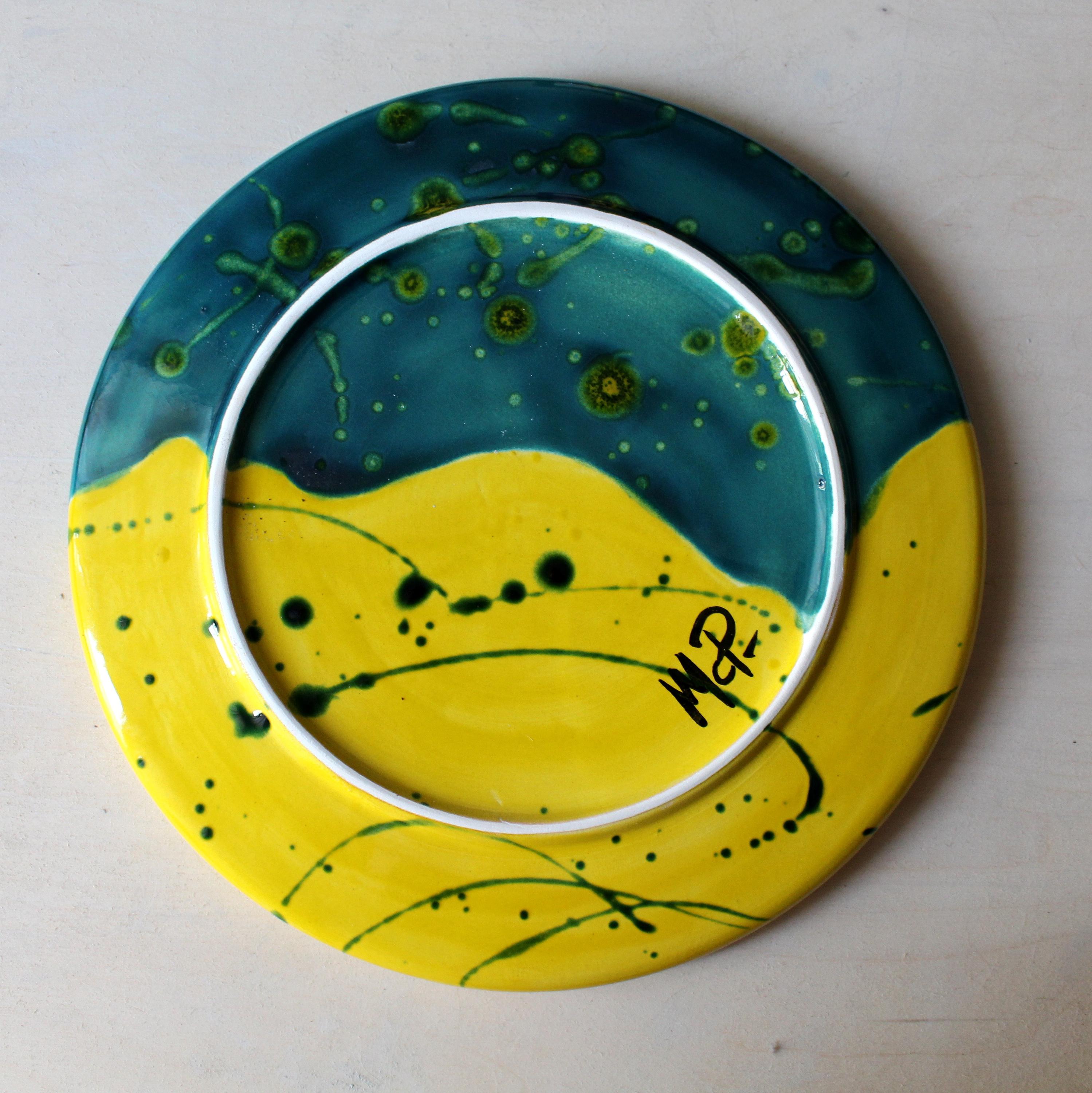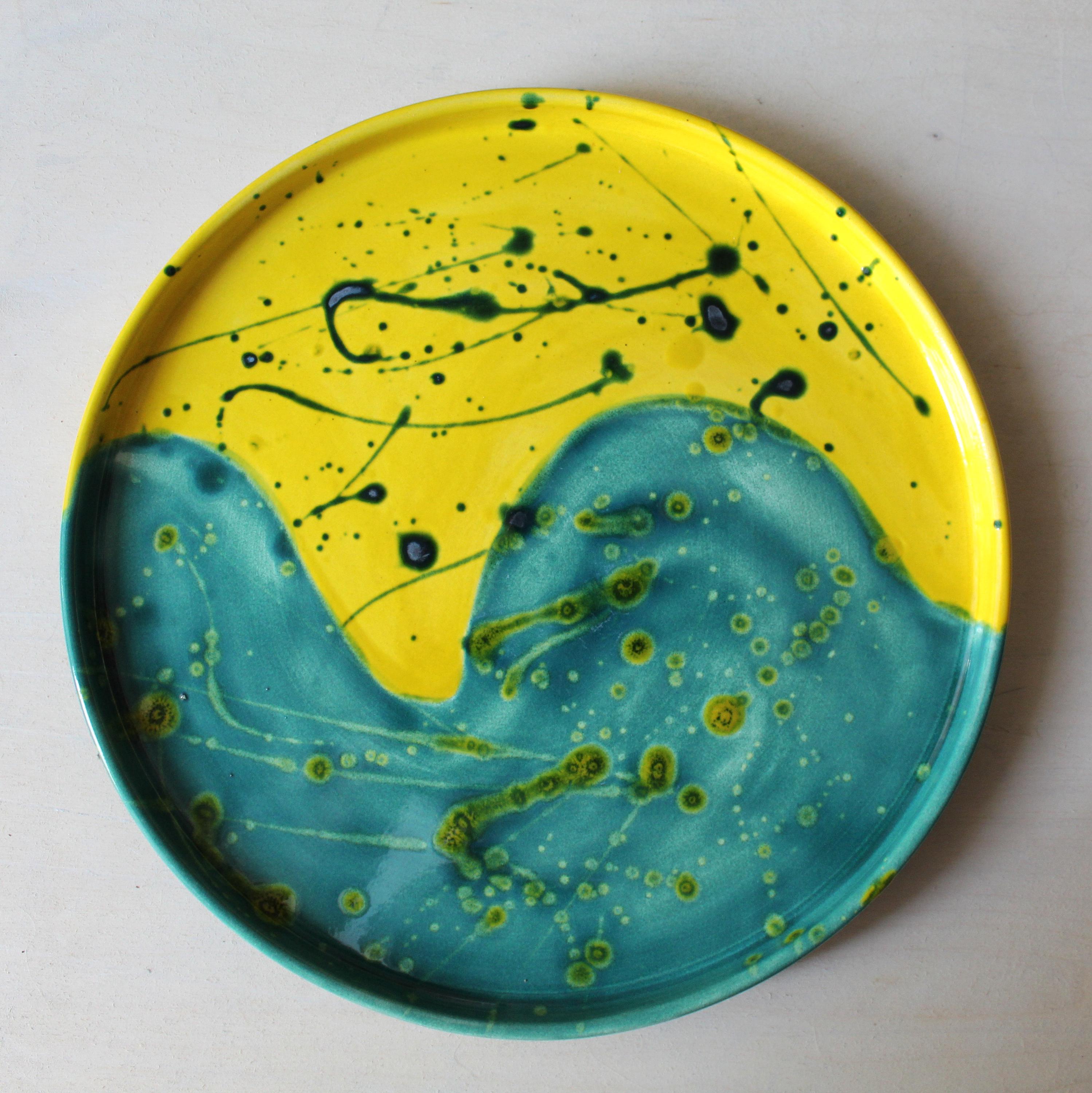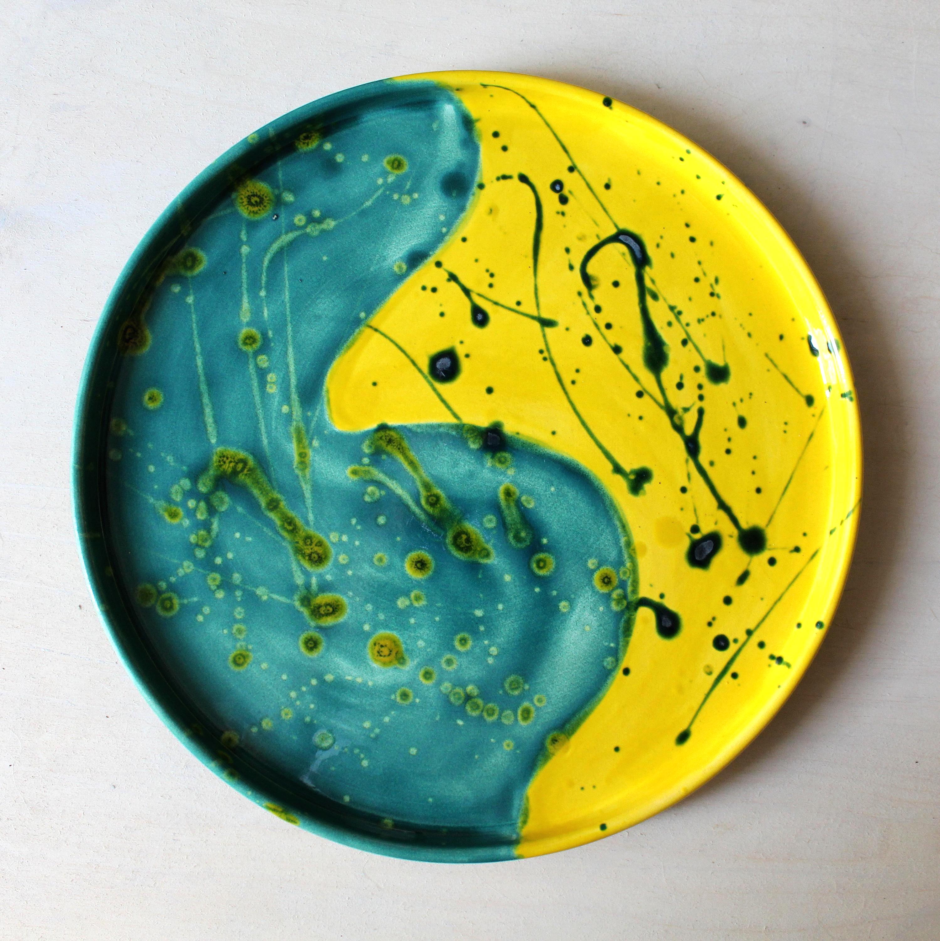Discover the unique "Art Fusion" plate, a handcrafted design piece, meticulously molded and glazed by hand. Crafted from high-quality ceramic, this 28 cm diameter plate combines art and functionality in a burst of modern colors: petrol green and sunny yellow meet in a vibrant, energetic contrast.