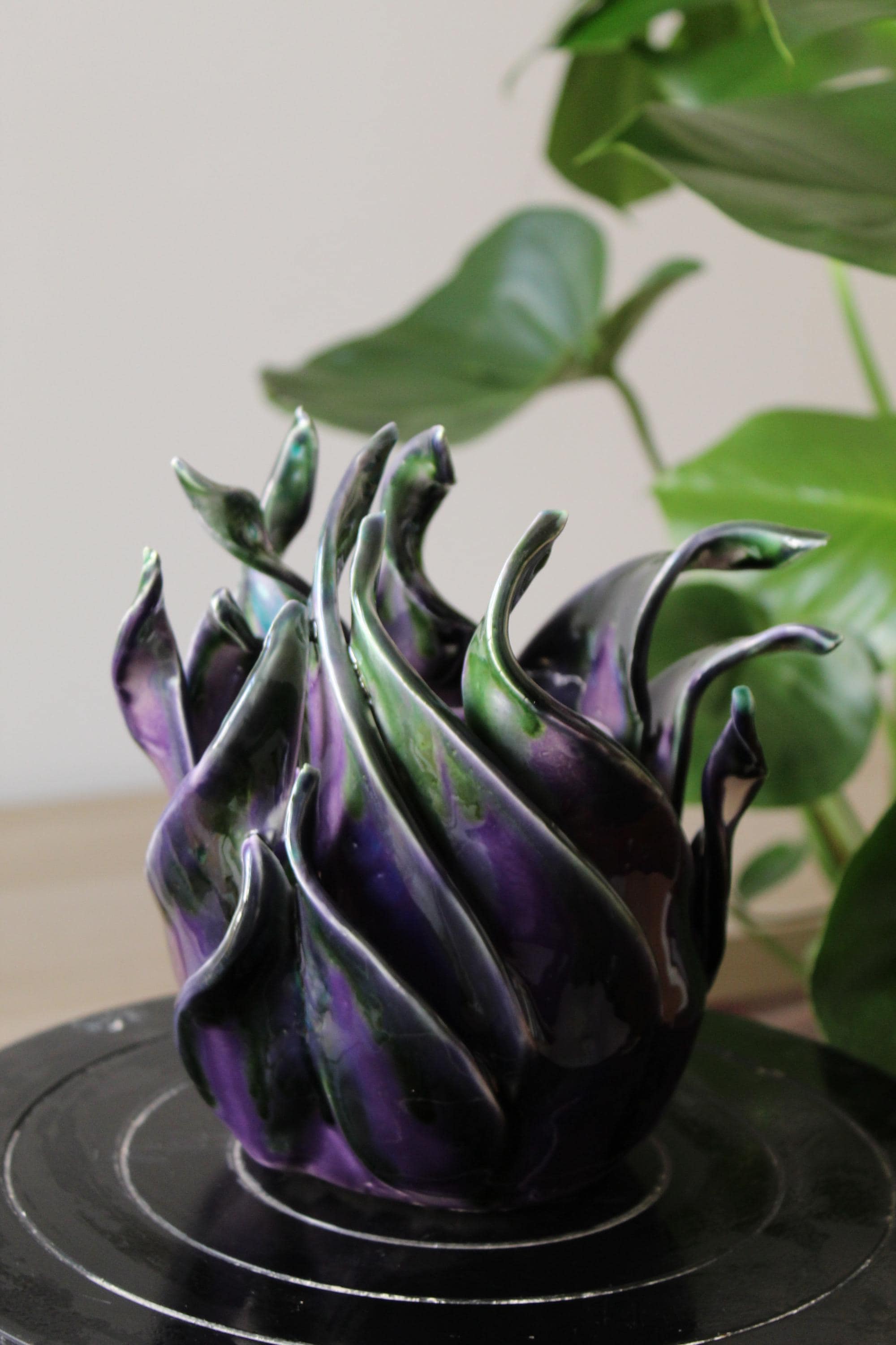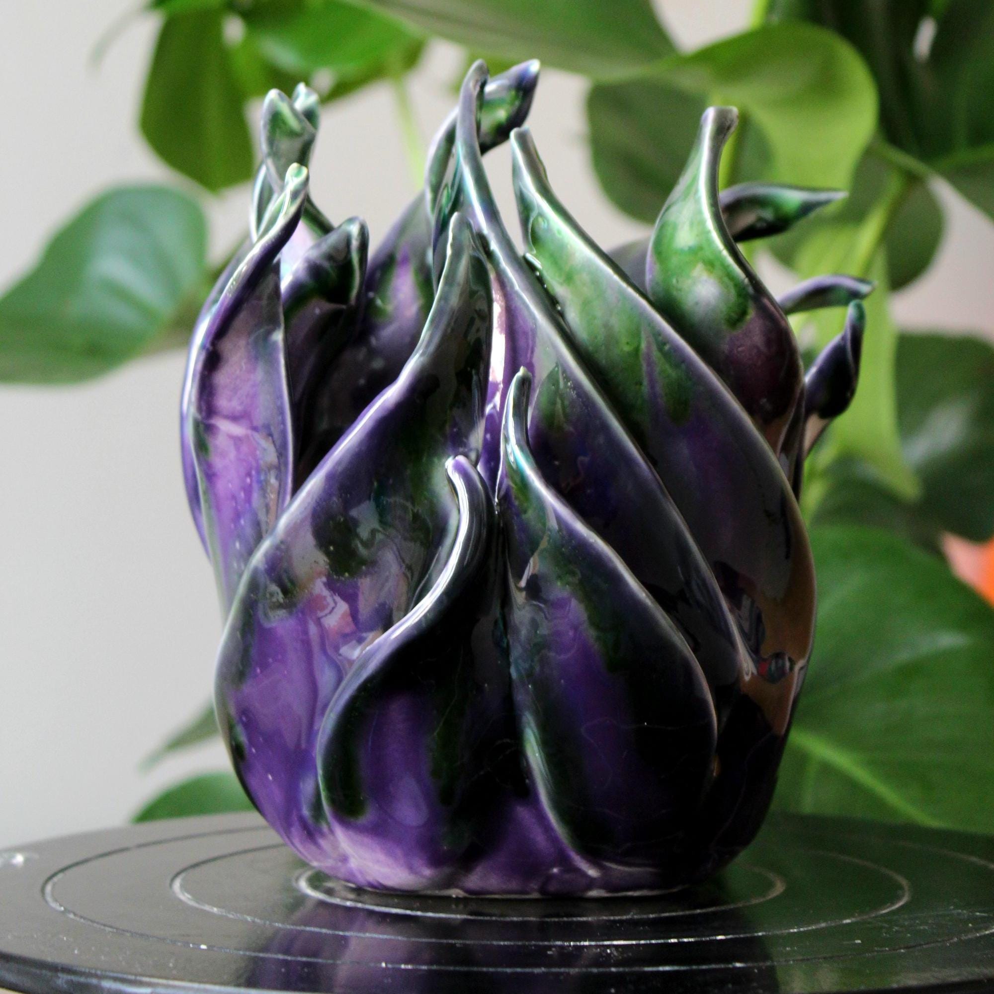 “Iride” is born from the dialogue between light and matter. Shaped entirely by hand in white clay, it is then colored with crystalline castings that melt during firing, creating fluid shades and iridescent reflections. Each curve captures the light differently, transforming it into a living play of transparencies.