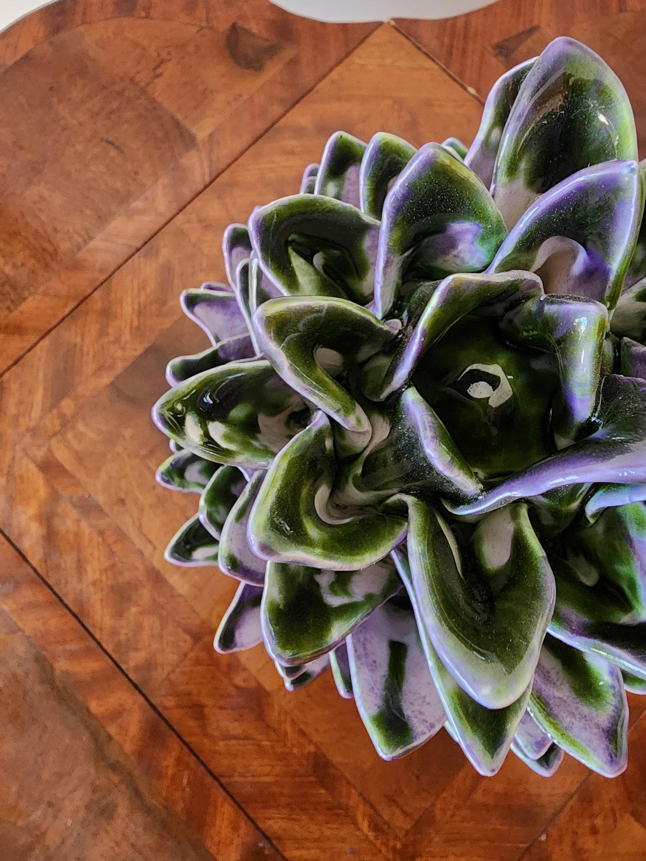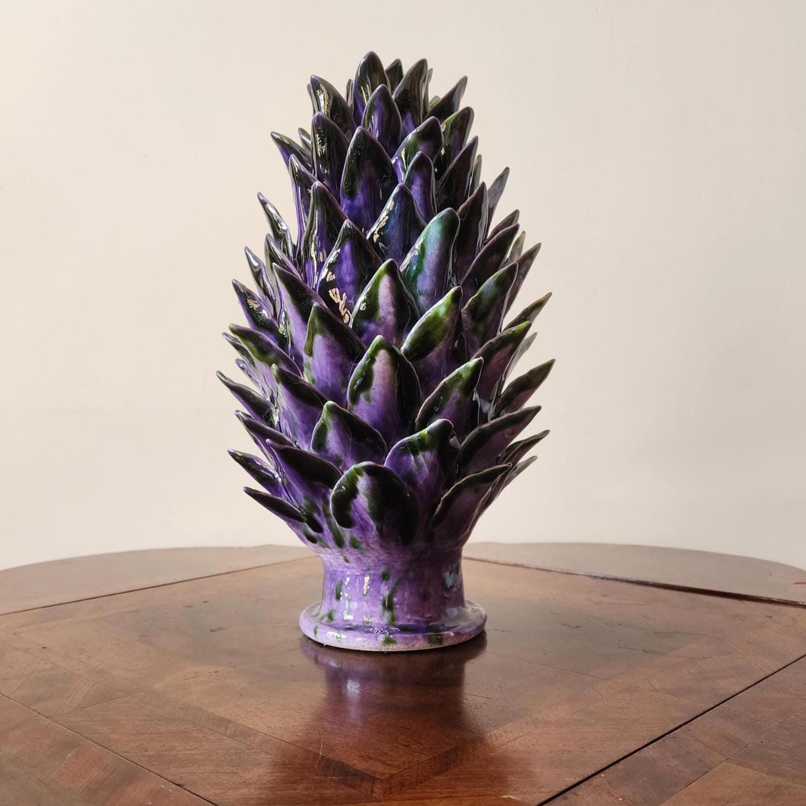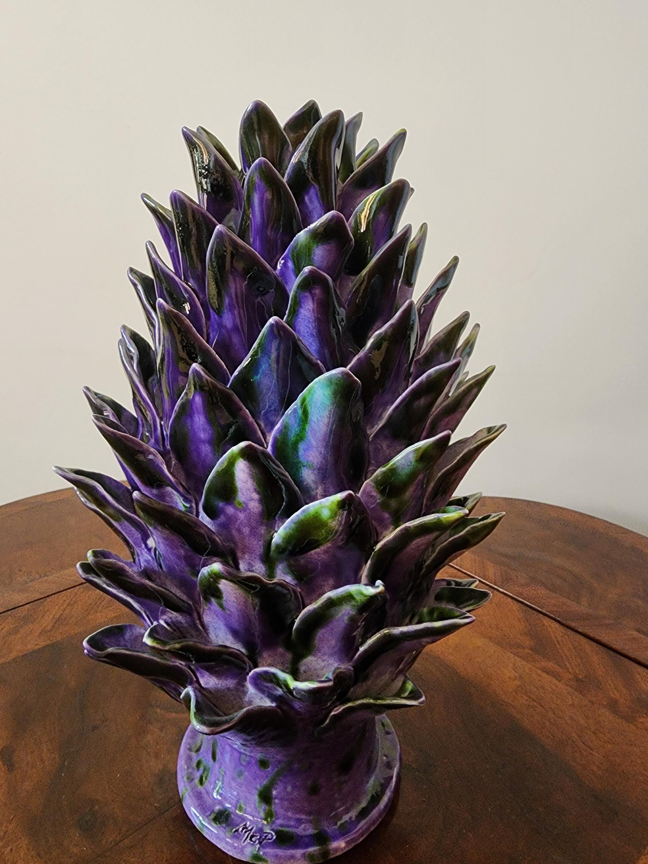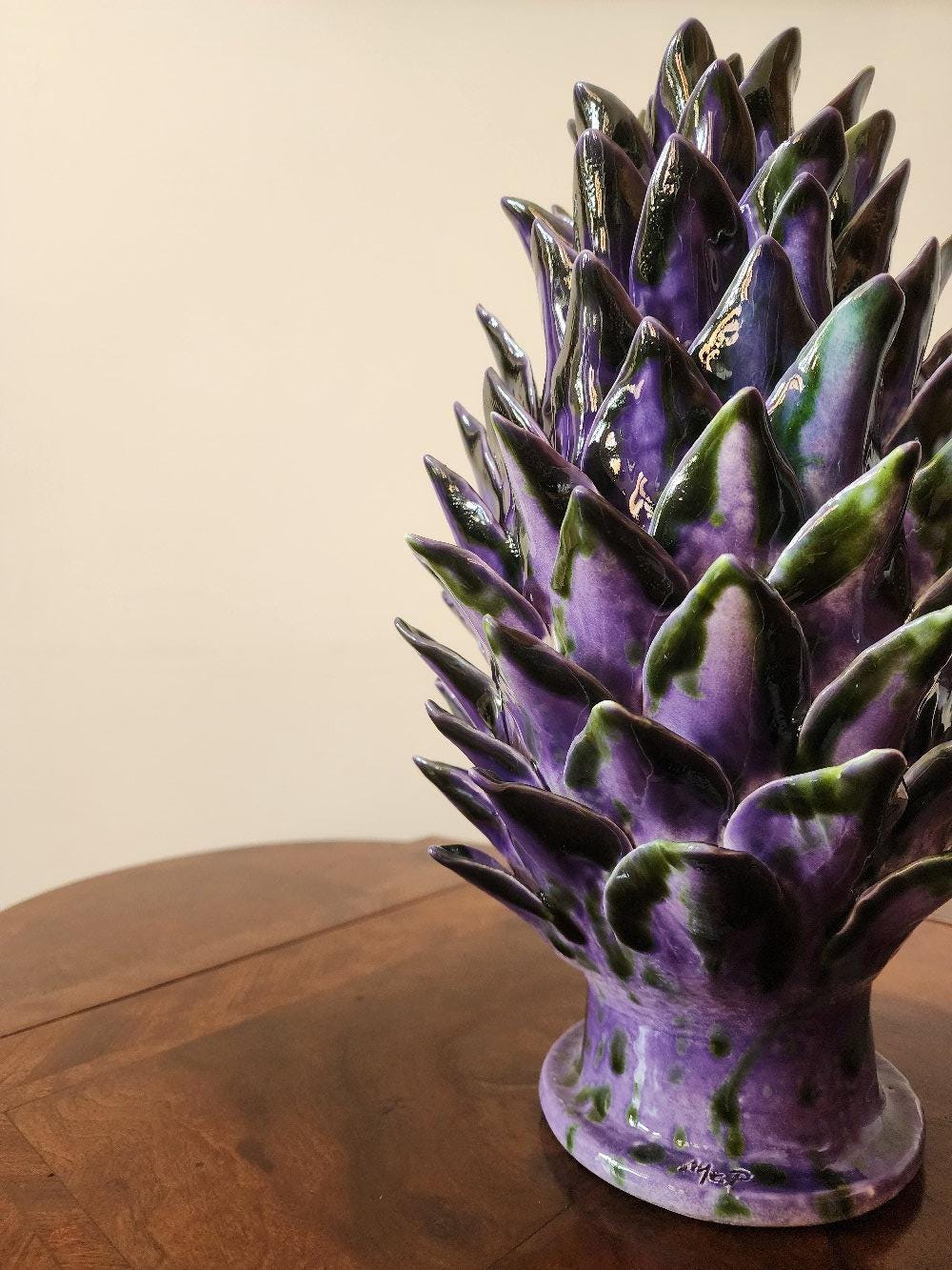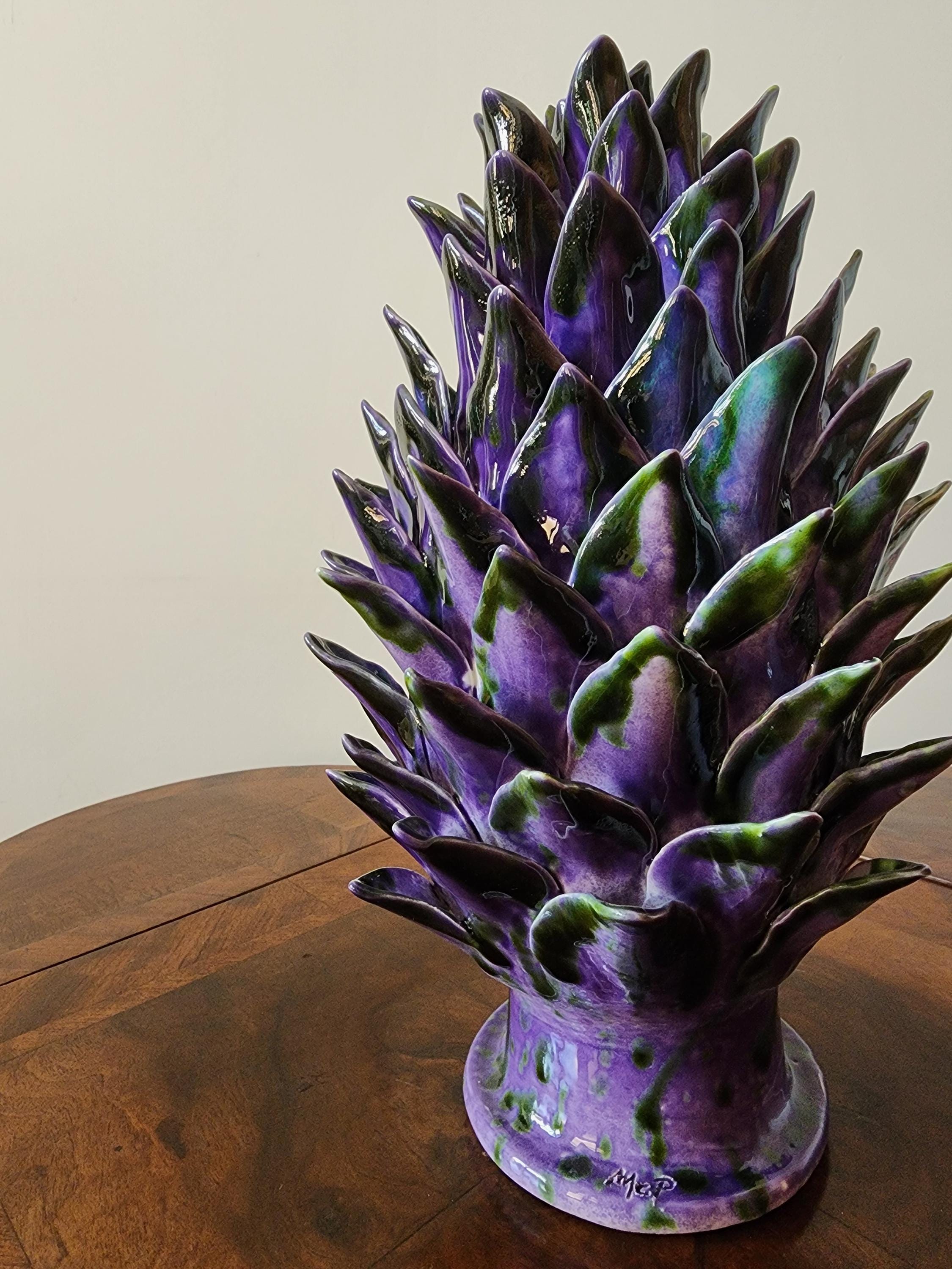Immerse yourself in the power of mythology and the allure of craftsmanship with Aegis, a ceramic sculpture brought to life in the Roman atelier of L'Avventurina Ceramiche. Inspired by the story of the muse Cynara, transformed into an artichoke by Zeus, this piece brings together the symbolism of metamorphosis and the beauty of nature. Hand-sculpted, the shape recalls the ascending, layered leaves of an artichoke, creating an upward movement that captures the gaze and the light. The surface is treated with crystalline enamels in an intense palette, where forest green blends with deep purple, creating luminous reflections and visual depth, making every corner a unique aesthetic experience. Each sculpture is an objet d'art, a unique piece, crafted in Italy with passion, perfect for transforming a living room, entryway, or study into a narrative space. Perfect gift for those who love high-quality craftsmanship, contemporary design, and objects that tell a story. 👉 Technical details: • Material: handcrafted ceramic • Approximate dimensions: approx. L 24 × D 35 × H 24 cm (as indicated on the original data sheet) • Colors: Mix of greens and purples with crystalline enamel finish • Processing: completely by hand • Unique piece: natural variations in texture and color testify to the craftsmanship ⚠️ Note: Slight variations in shade and finish are a distinctive feature of each handcrafted work and make Aegis even more exclusive.