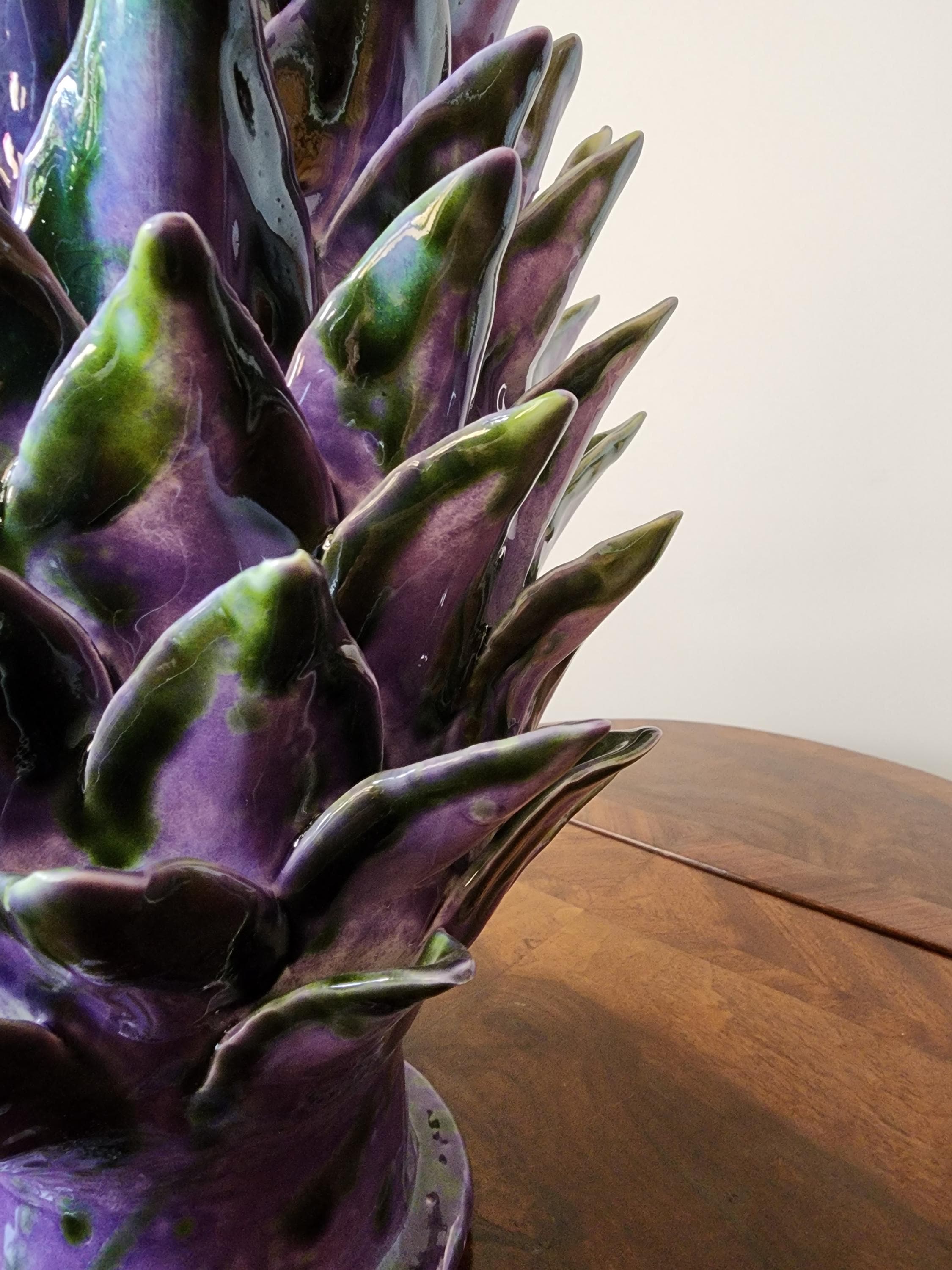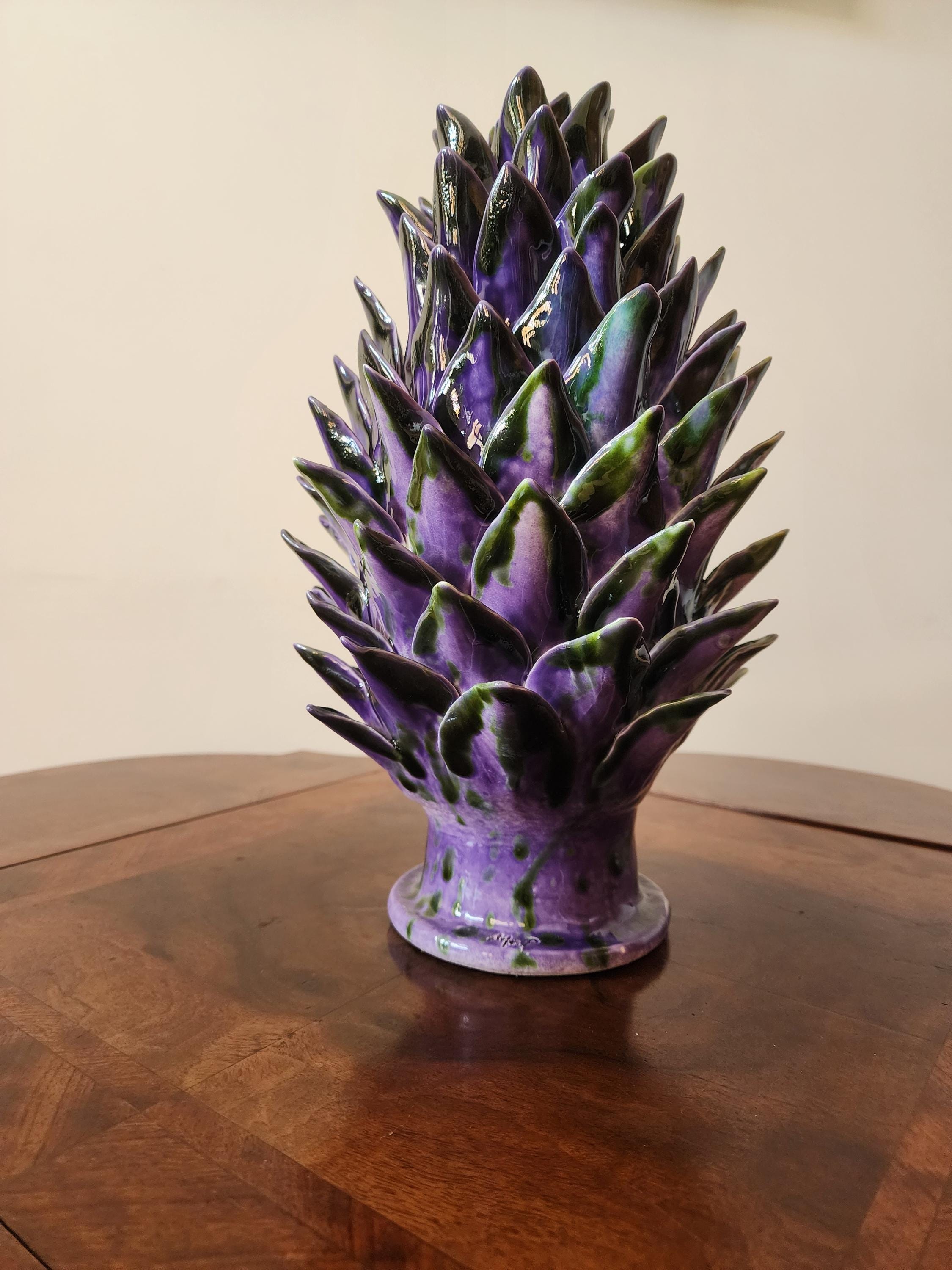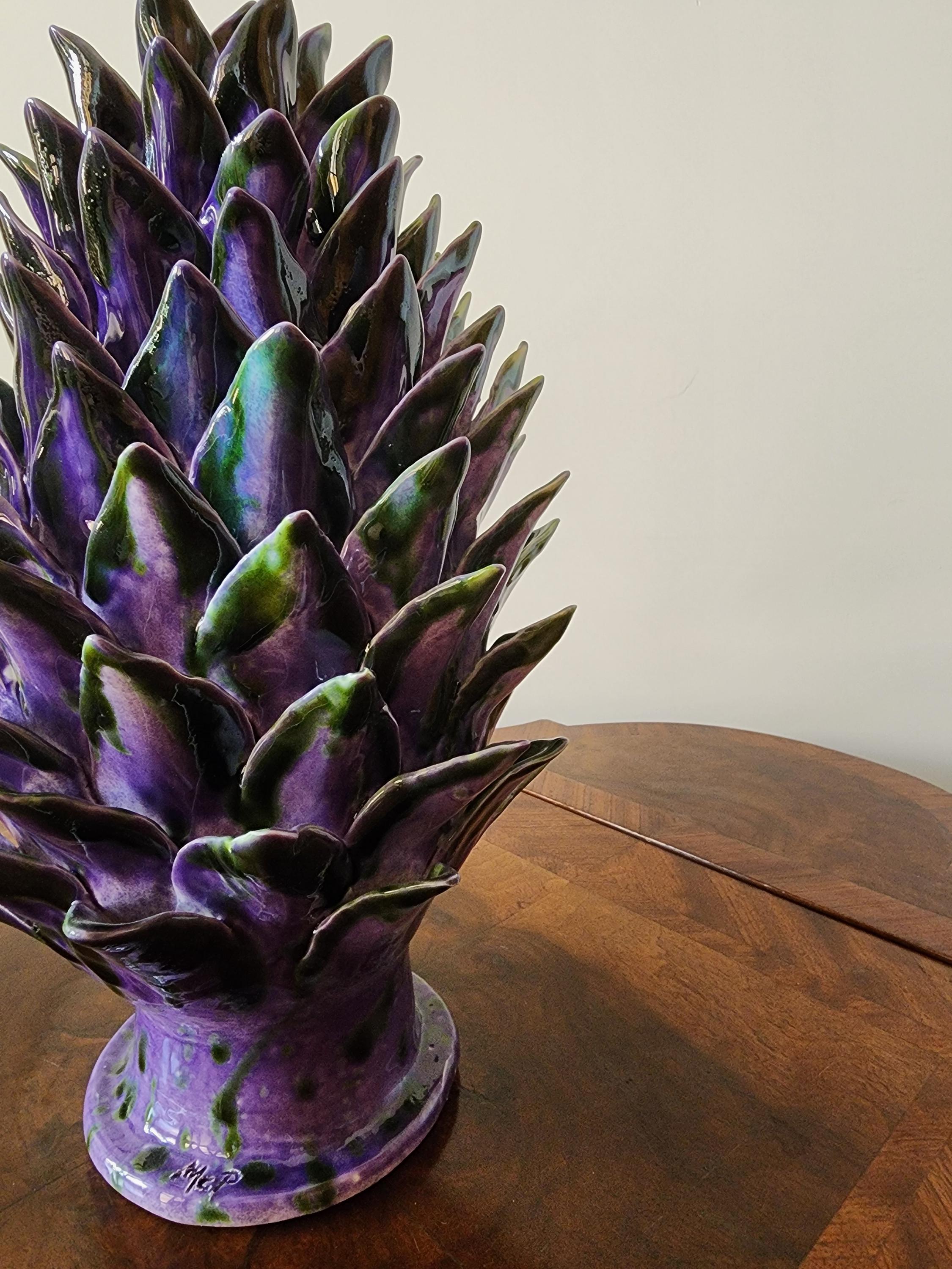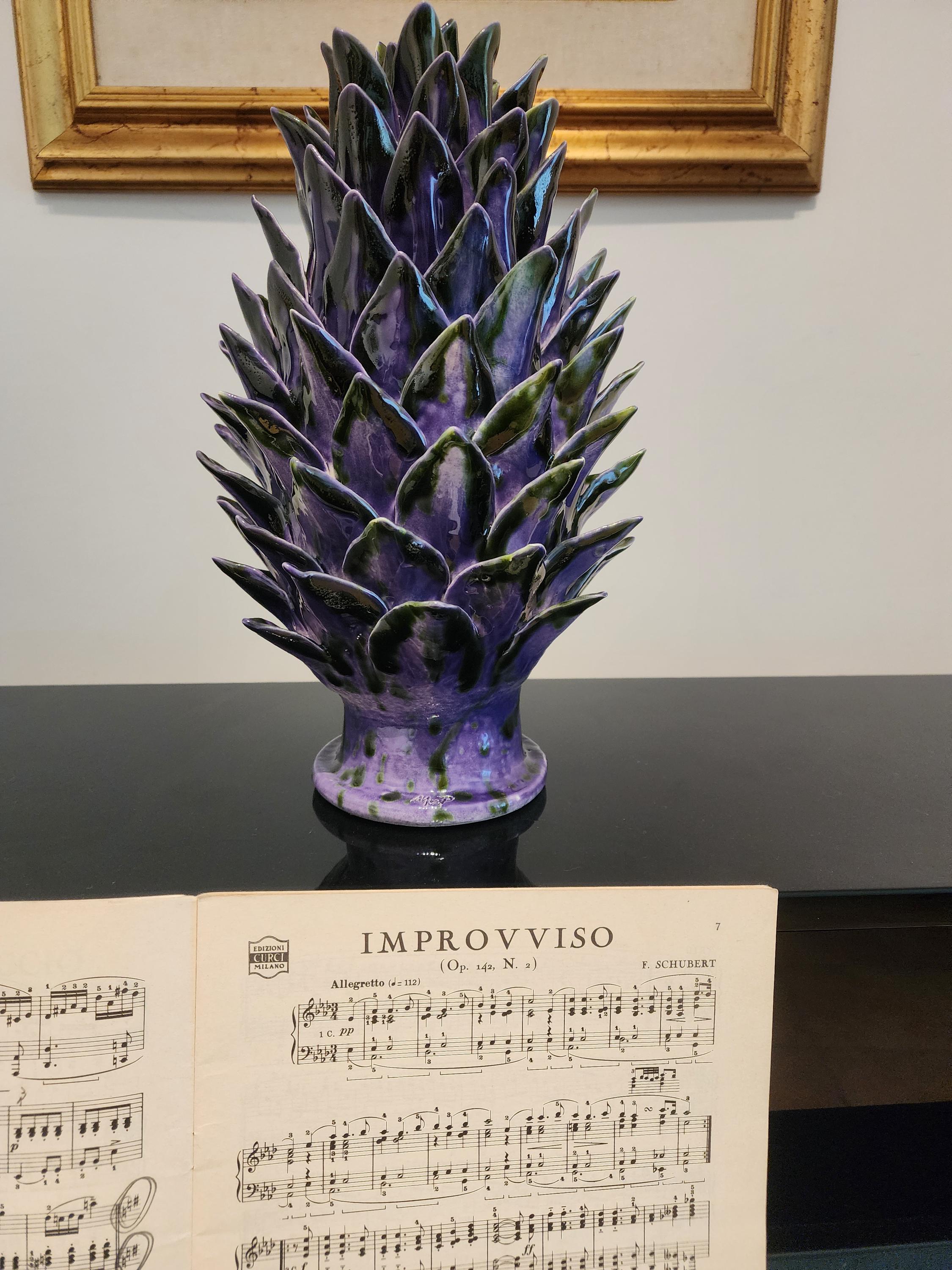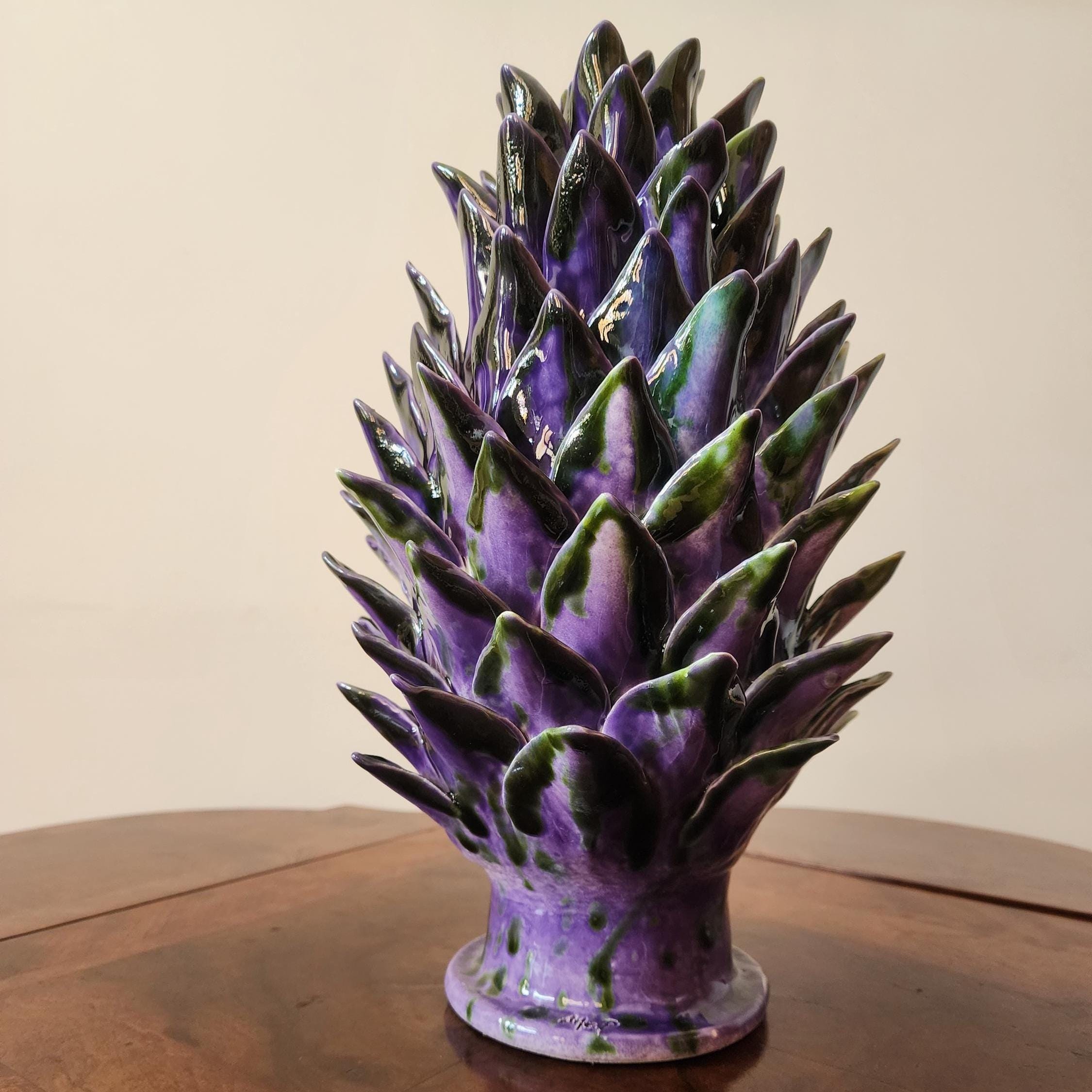 Immerse yourself in the power of mythology and the allure of craftsmanship with Aegis, a ceramic sculpture brought to life in the Roman atelier of L'Avventurina Ceramiche. Inspired by the story of the muse Cynara, transformed into an artichoke by Zeus, this piece brings together the symbolism of metamorphosis and the beauty of nature. Hand-sculpted, the shape recalls the ascending, layered leaves of an artichoke, creating an upward movement that captures the gaze and the light. The surface is treated with crystalline enamels in an intense palette, where forest green blends with deep purple, creating luminous reflections and visual depth, making every corner a unique aesthetic experience. Each sculpture is an objet d'art, a unique piece, crafted in Italy with passion, perfect for transforming a living room, entryway, or study into a narrative space. Perfect gift for those who love high-quality craftsmanship, contemporary design, and objects that tell a story. 👉 Technical details: • Material: handcrafted ceramic • Approximate dimensions: approx. L 24 × D 35 × H 24 cm (as indicated on the original data sheet) • Colors: Mix of greens and purples with crystalline enamel finish • Processing: completely by hand • Unique piece: natural variations in texture and color testify to the craftsmanship ⚠️ Note: Slight variations in shade and finish are a distinctive feature of each handcrafted work and make Aegis even more exclusive.