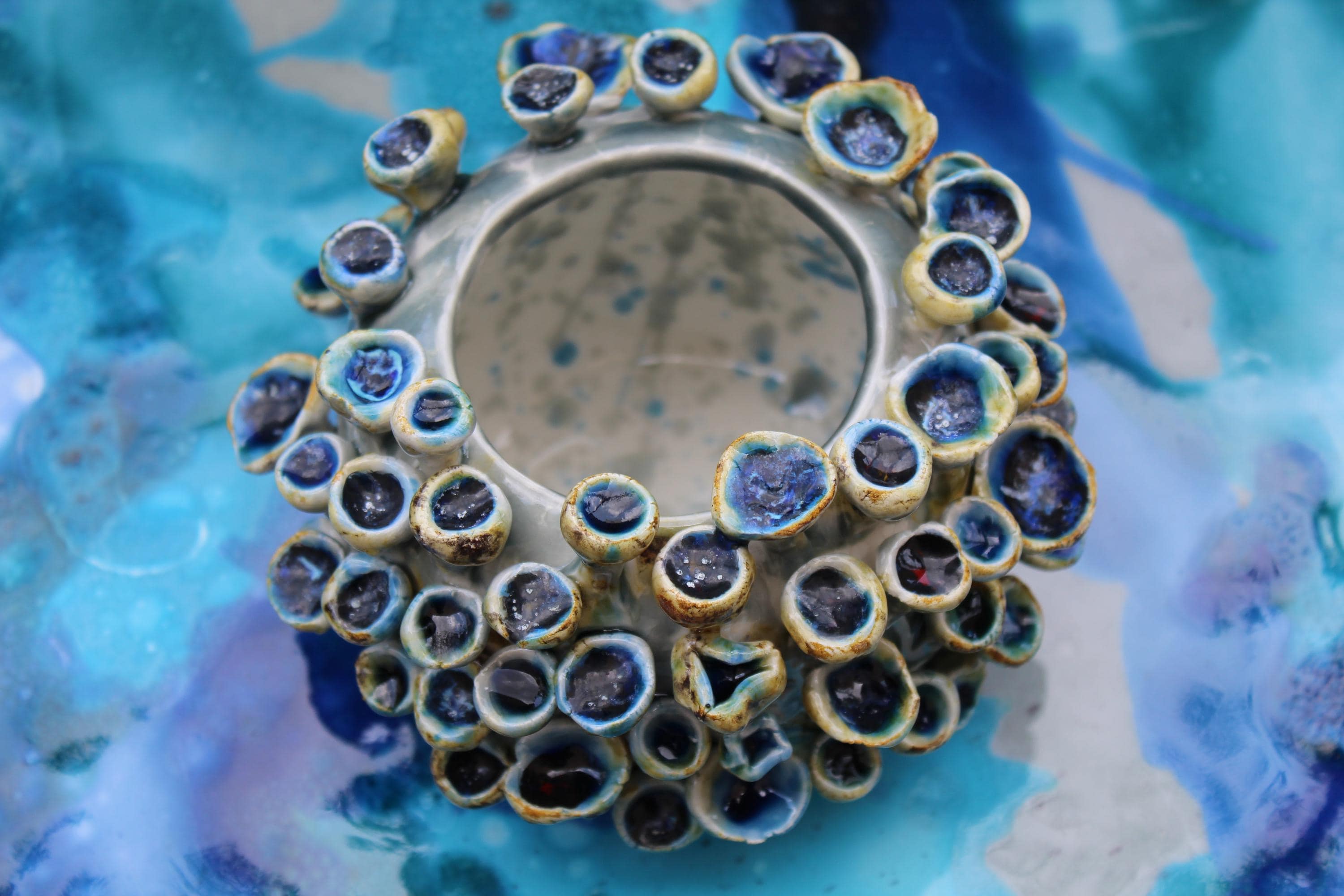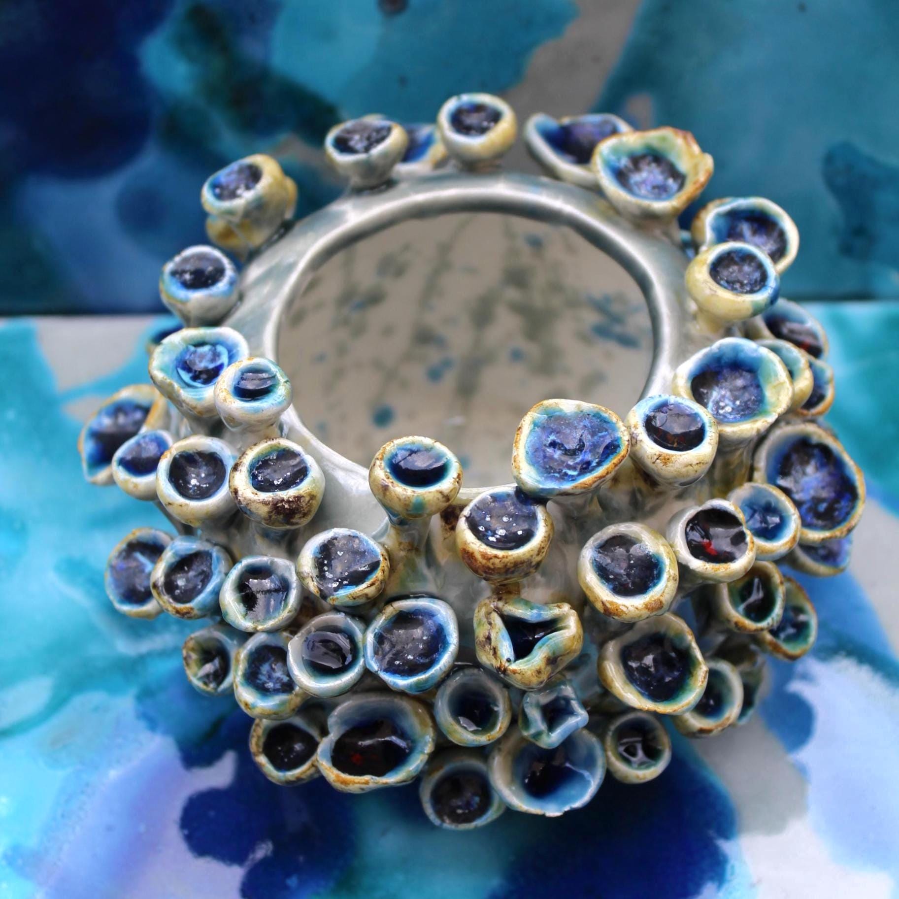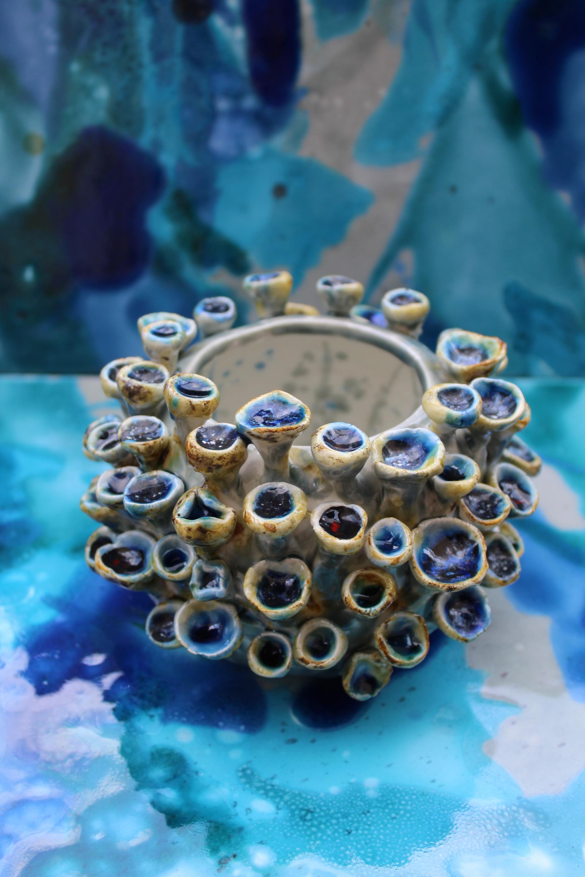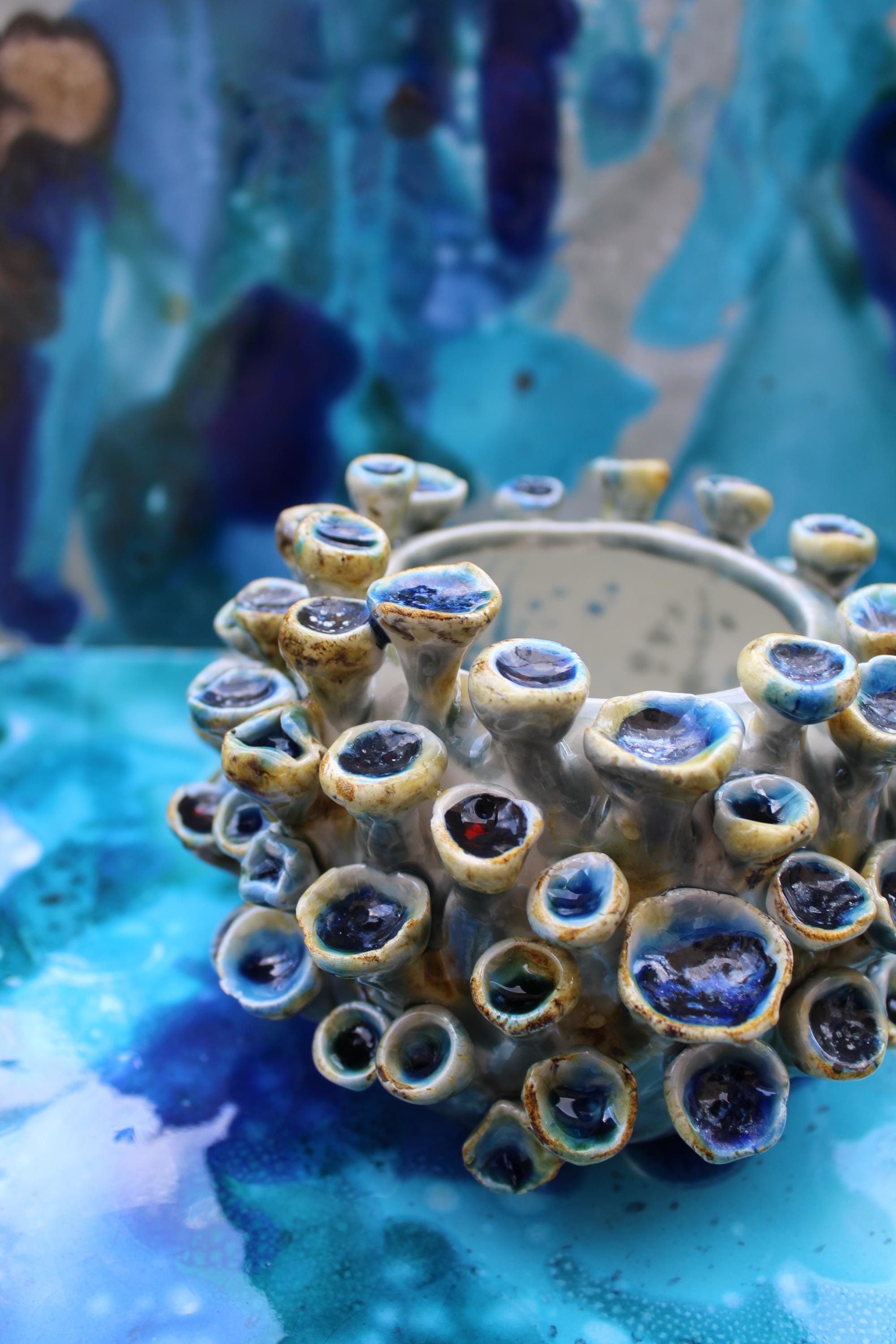 Its glossy multicolor glaze reflects shades of blue, turquoise, amber, and earthy tones, creating depth, luminosity, and an almost aquatic iridescence. The piece plays beautifully with natural and artificial light, especially when used as a candle holder, allowing reflections and shadows to emphasize its texture and structure.