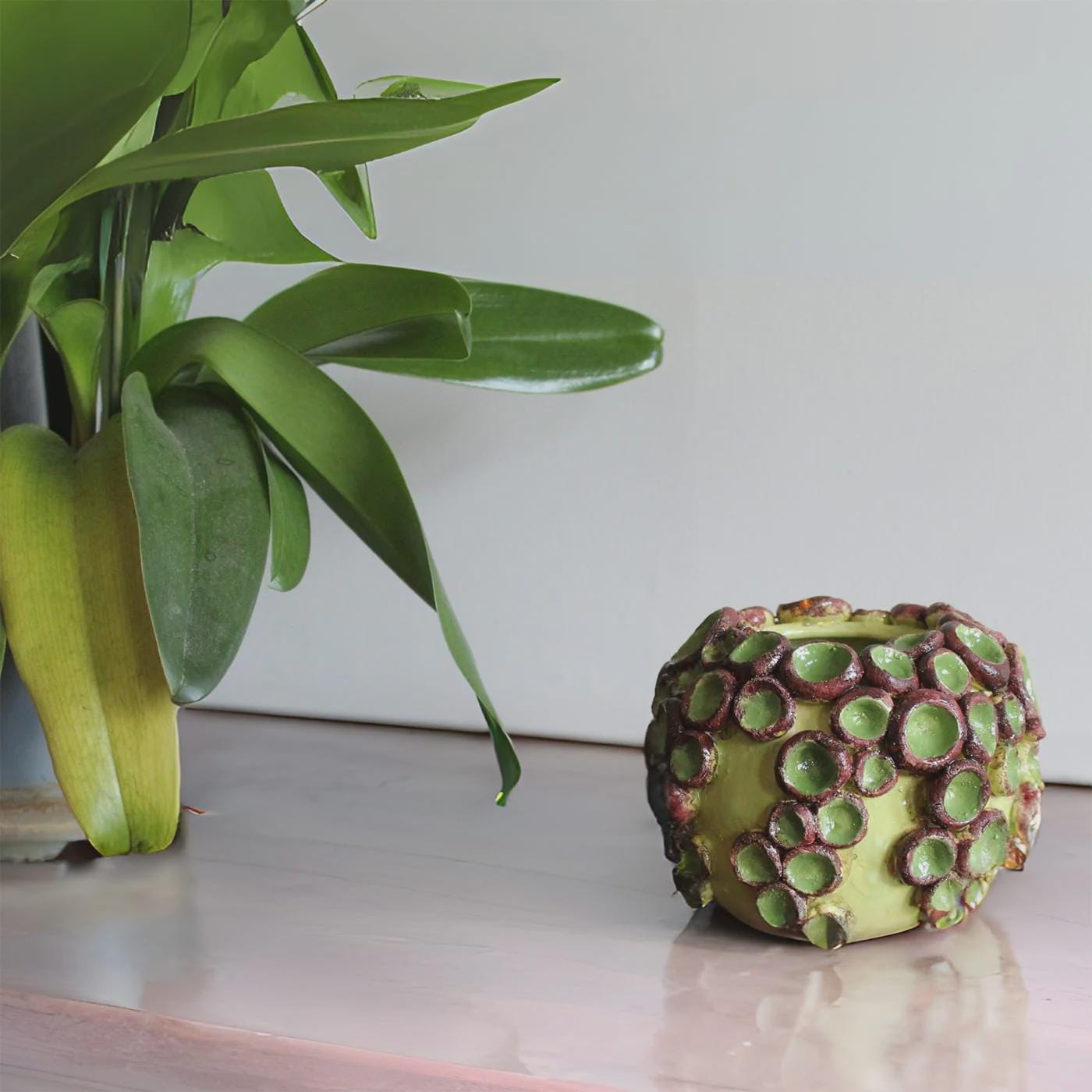 Crafted from fine fireclay, Melia stands out for its use of iridescent glazes and aventurine, which capture the golden light filtering through the foliage, conveying a sense of natural magic. The deep green tones recall the nuances of dewy bark, while the unique surfaces combine rough textures with smooth, luminous areas, creating a harmonious balance between primitiveness and refinement.