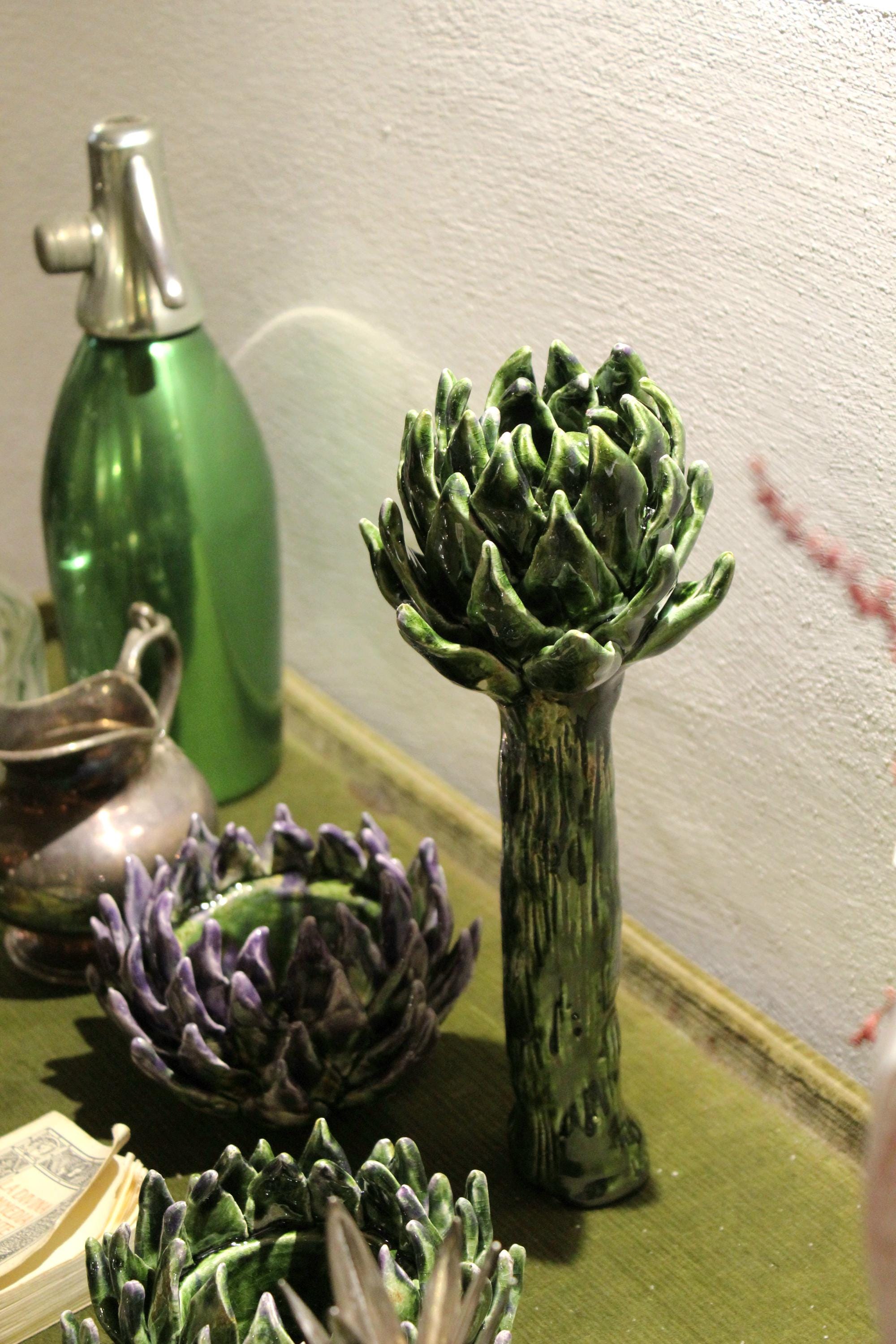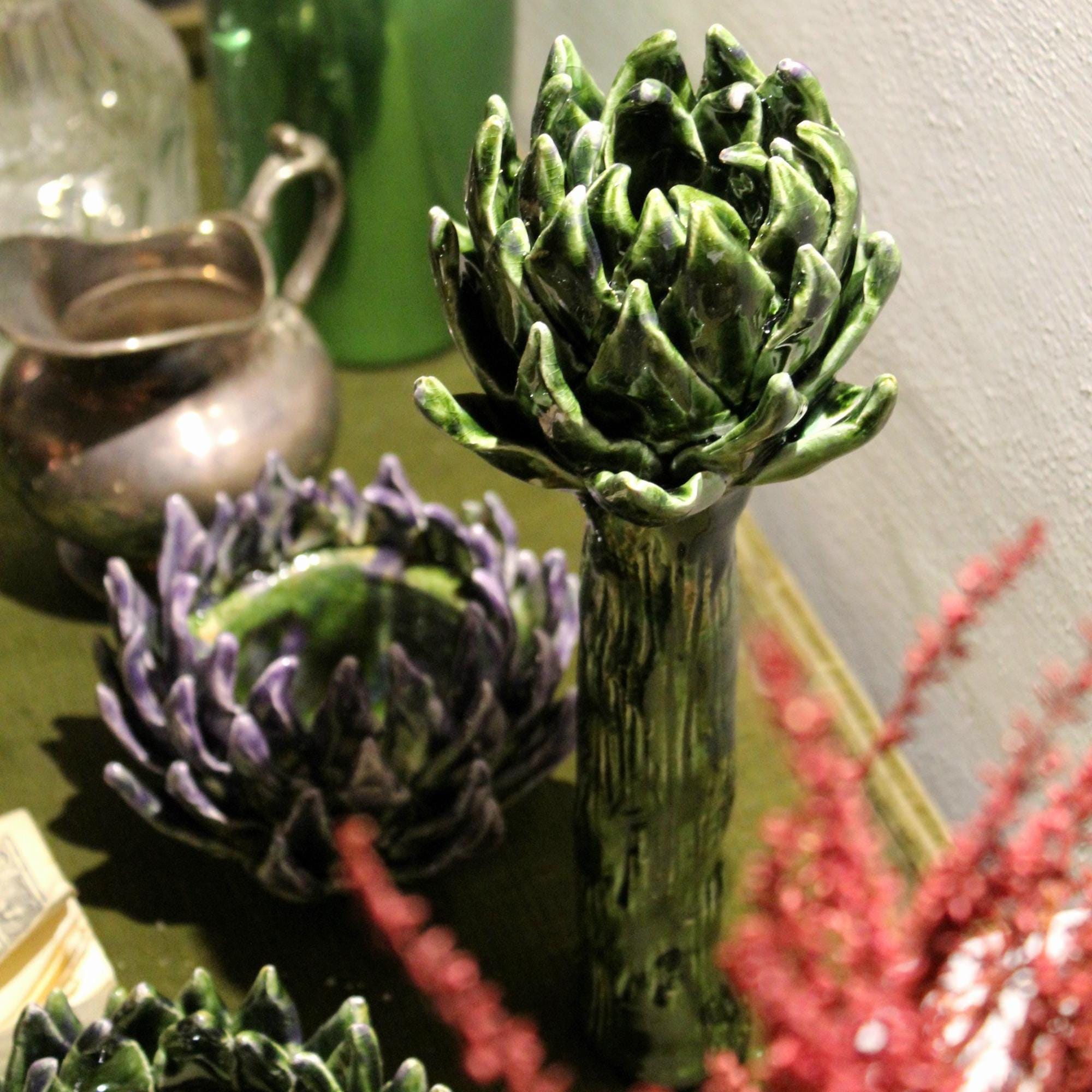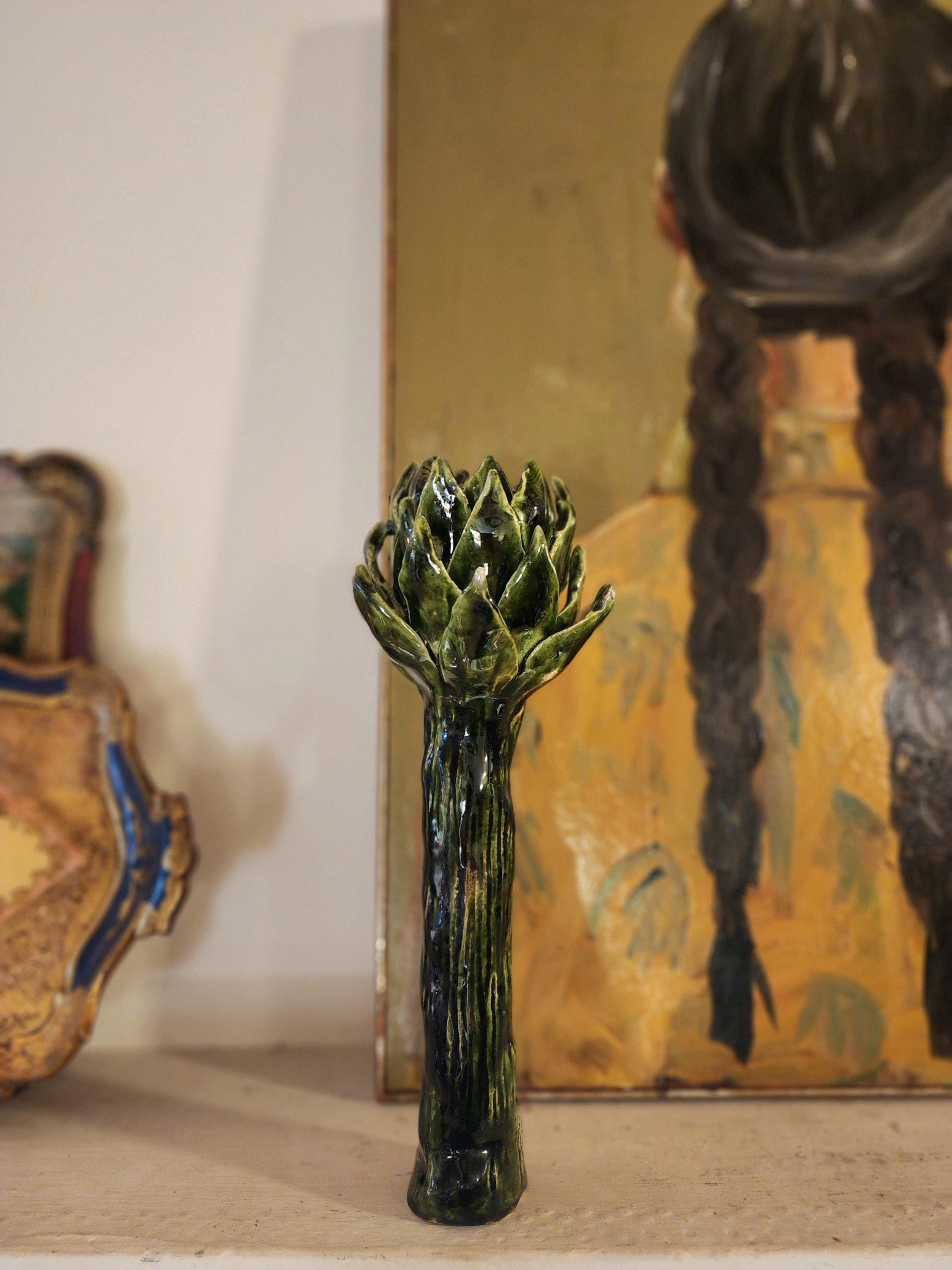 An artichoke that is not nature imitated, but nature interpreted. The leaves close and open like an intimate gesture, guarding a center that does not immediately give itself away. The deep green enamel vibrates with shades, shiny and irregular, as if alive. It is an object that speaks of care, time, slowness and tactile desire. Designed as a candle holder, it welcomes the flame and transforms it into presence. Made entirely by hand, each piece is unique